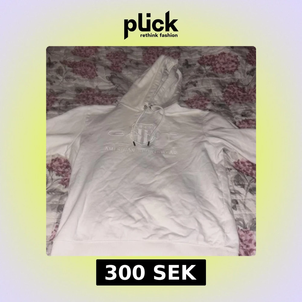 Säljer en stilren vit hoodie från GANT med broderad logga på framsidan. Hoodien har en justerbar dragsko i huvan och är perfekt för en avslappnad look. Passar bra till både jeans och joggers.