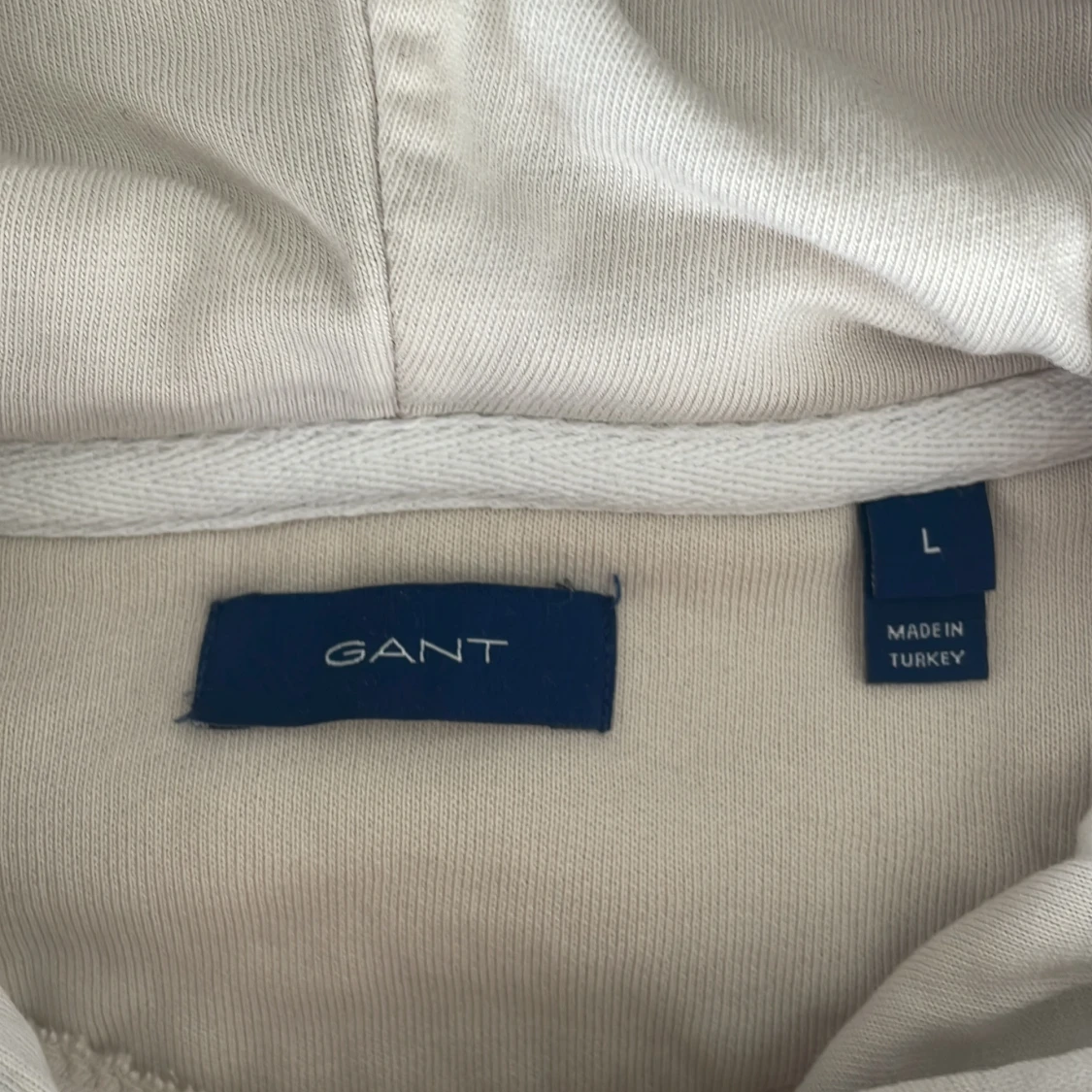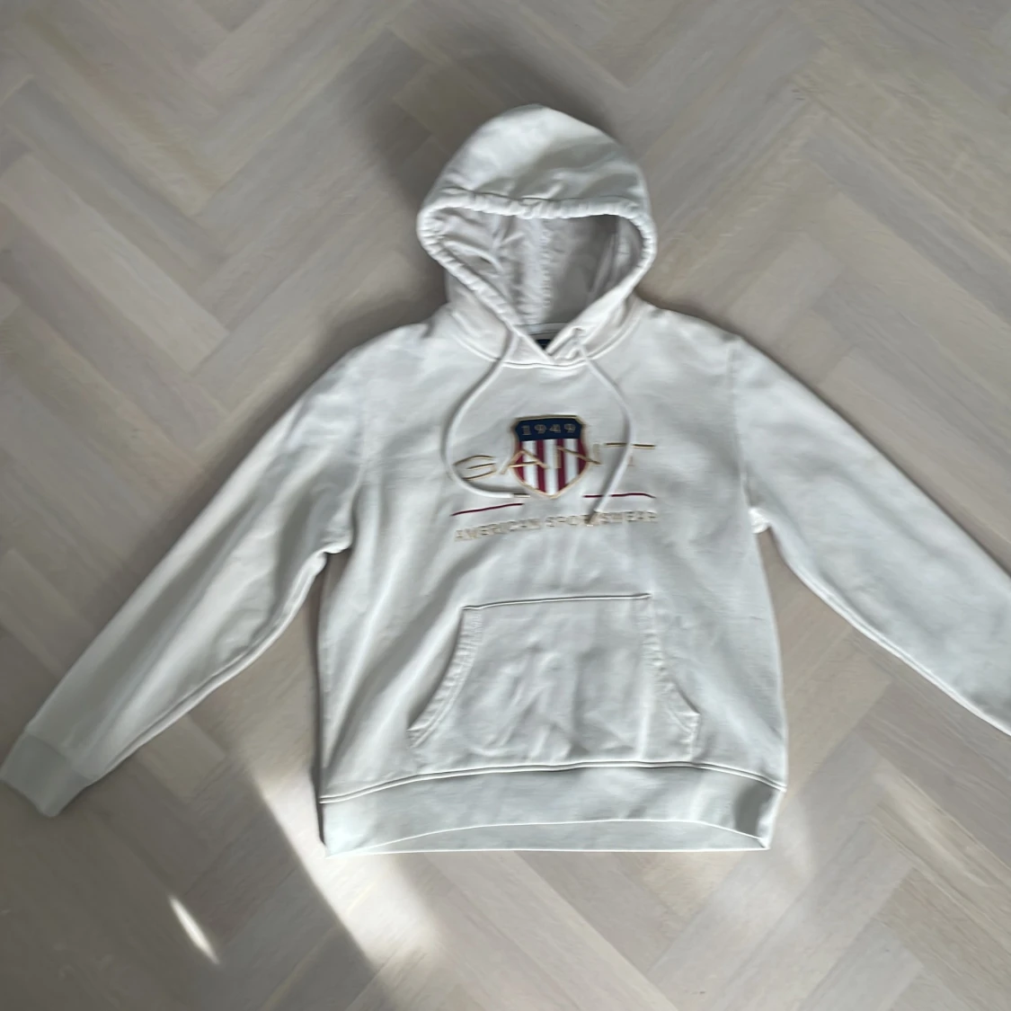 Säljer en stilren vit hoodie från GANT med en broderad logotyp och känguruficka. Perfekt för en avslappnad stil. Har en liten fläck på vänster ärm, men inget märkbart. Huvan har dragsko och tröjan är tillverkad i mjukt material. Storlek L, skulle även tro att den passar M.