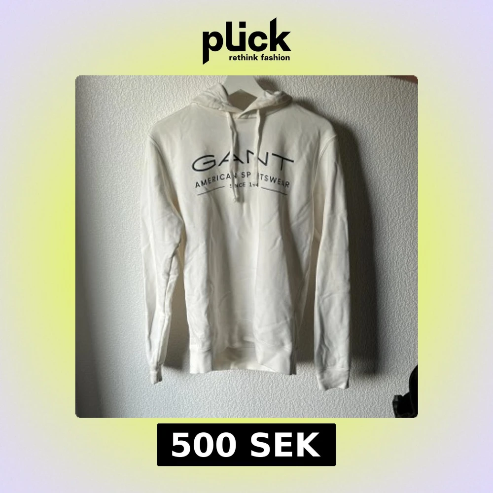 Vit hoodie från GANT med svart tryck på bröstet där det står 'GANT American Sportswear'. Tröjan har huva med snörning och långa ärmar. Mjuk och skön bomullskänsla, perfekt för en chill och stilren look.