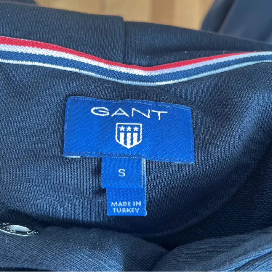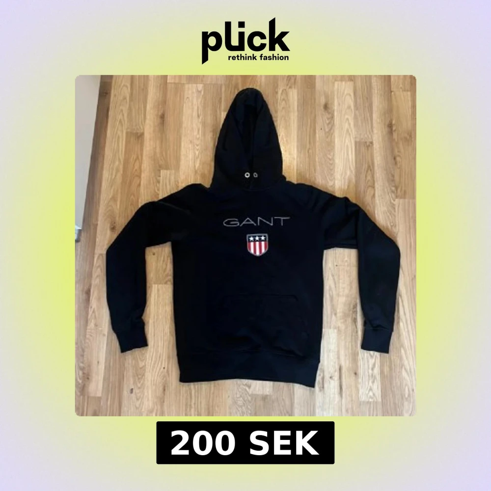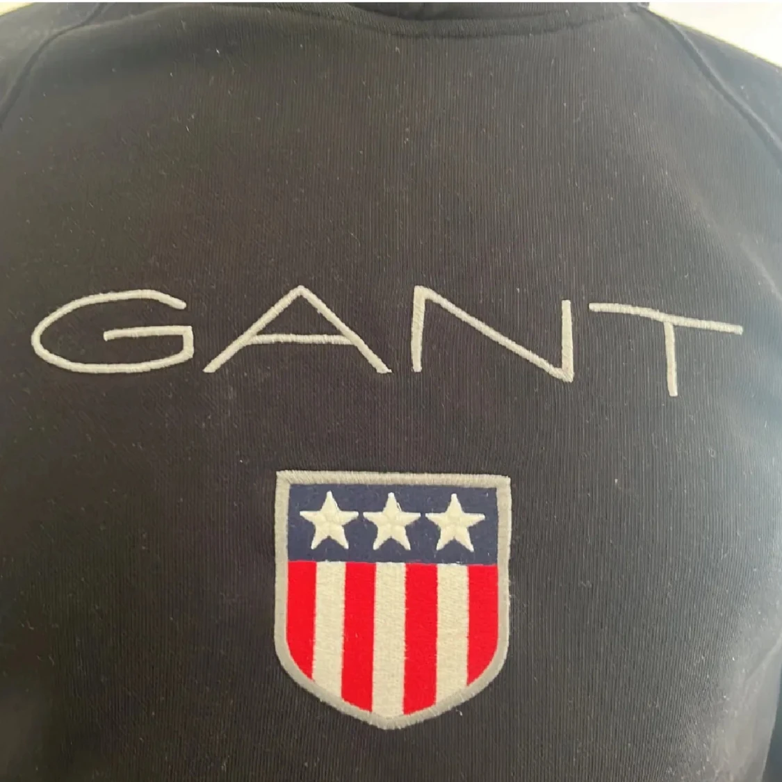 Svart hoodie från GANT i storlek S med stor broderad logga och emblem på bröstet. Tröjan har huva med snörning, magficka och långa ärmar. Materialet är mjuk bomull och polyester, perfekt för chill dagar. Klassisk och stilren design med vita och röda detaljer.