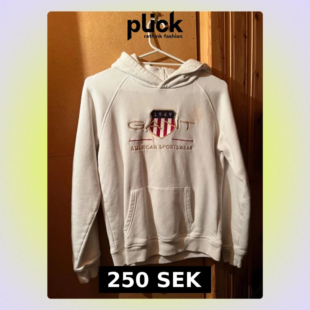 Vit hoodie från GANT med broderad logga och emblem på bröstet. Är från kidsbrandstore så är storlek 158/164 (13-14år). Skulle säga att det är som typ S för de är de jag har vanligtvis o den passar mig. Kommer bara aldrig till användning, jag har kanske använt den max 3ggr!