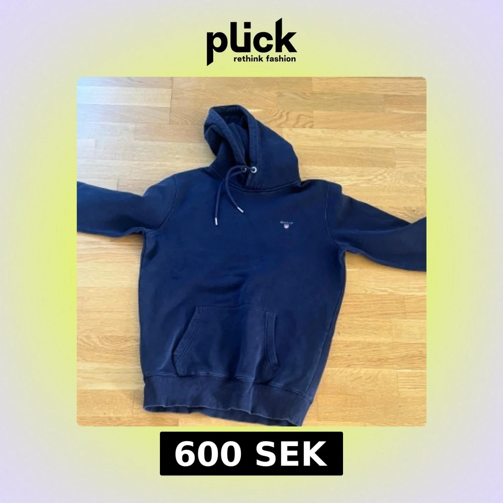 Säljer en marinblå hoodie från GANT i storlek S. Tröjan har broderad logga på bröstet, stor känguruficka och justerbar huva med snörning. Mjuk bomullskänsla och ribbade muddar vid ärmslut och nederkant.