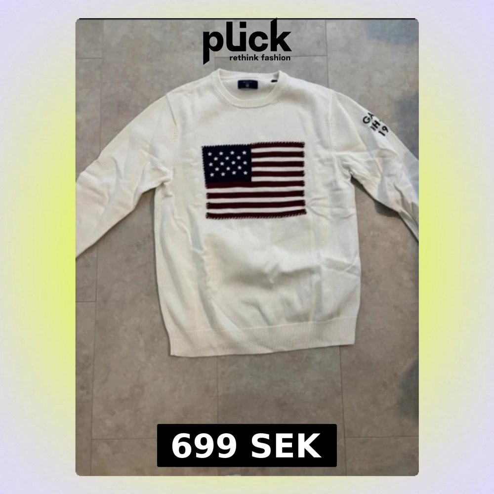 Vit stickad tröja från GANT med amerikansk flagga broderad på bröstet och blå text 'GANT NH-CT 1949' på ena ärmen. Tröjan har rund hals och ribbade muddar vid ärmslut och nederkant. Perfekt för dig som gillar klassisk college-stil.