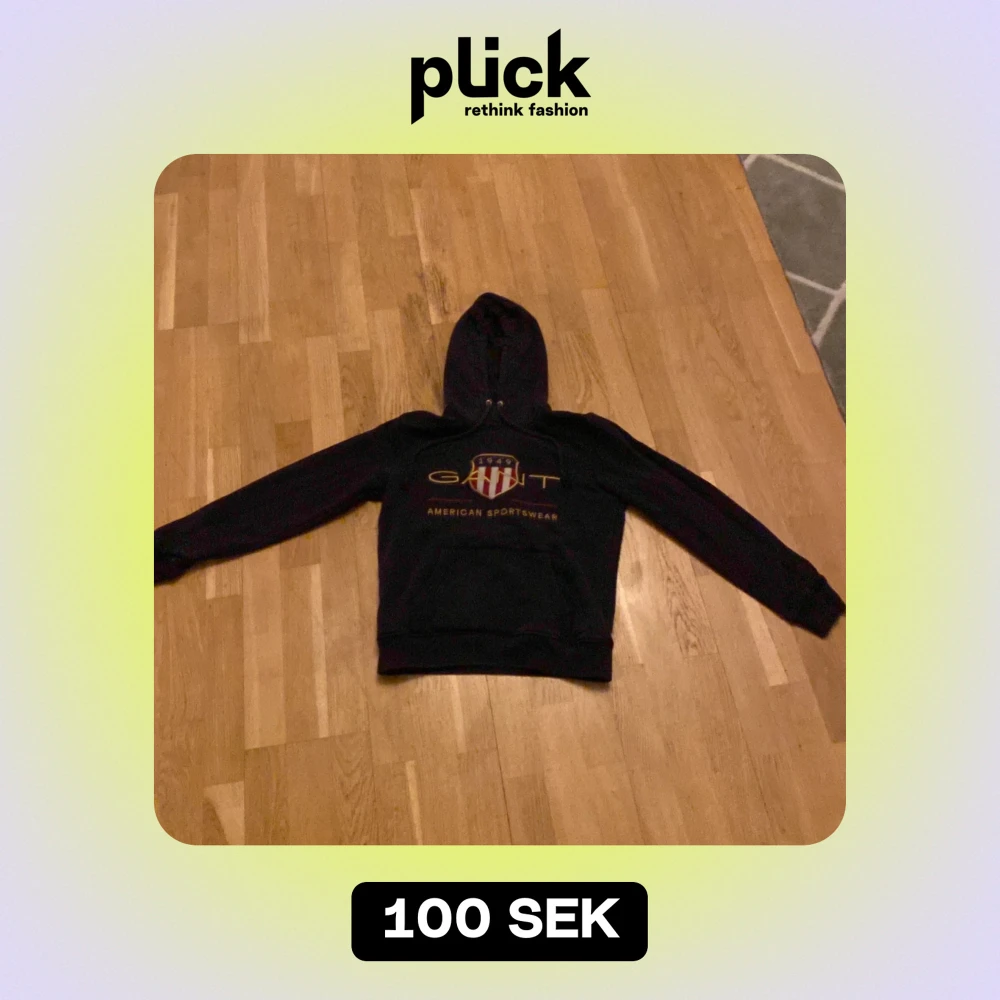 Säljer en svart hoodie från GANT med broderad logga och texten 'American Sportswear' på framsidan. Hoodien har en klassisk design med justerbar huva och långa ärmar. Perfekt för en avslappnad stil.