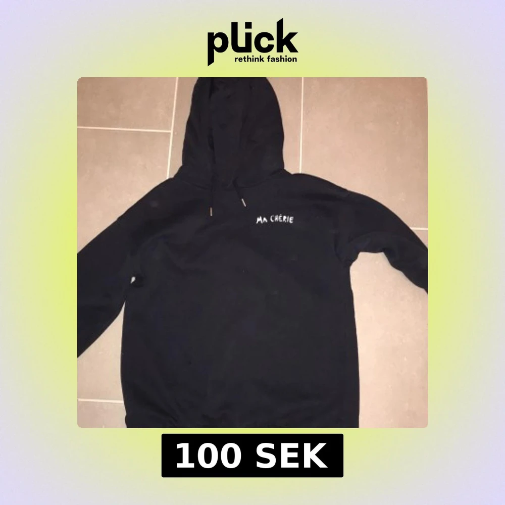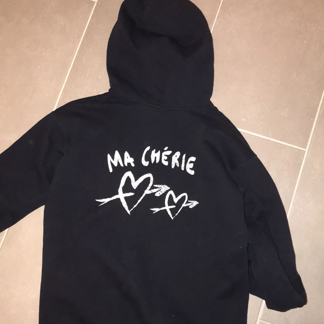Säljer en mörkblå hoodie från Gina Tricot med texten 'Ma Chérie' och hjärtmotiv på ryggen. Perfekt för en avslappnad stil. Hoodien har en klassisk design med huva och långa ärmar. Trendig och mysig😋