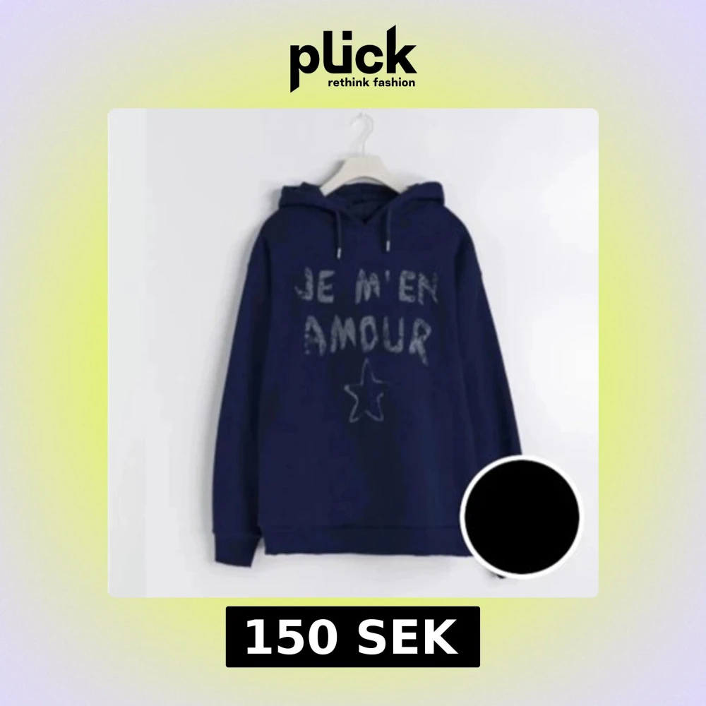 Marinblå hoodie från Gina Tricot med glittrig text 'JE M'EN AMOUR' och en stjärna framtill. Tröjan har huva med snörning och långa ärmar.