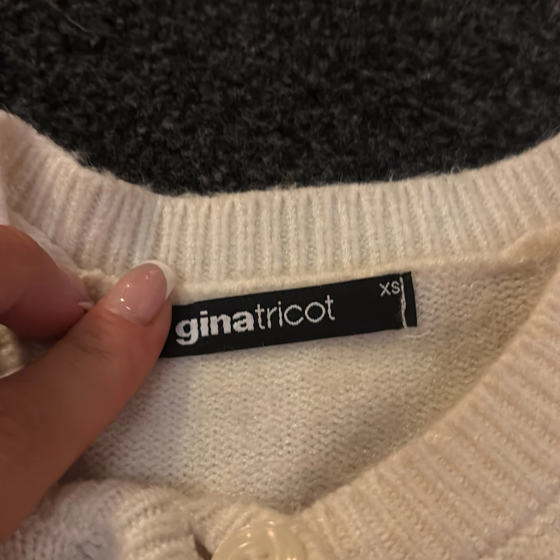 Säljer en stilren vit kofta från Gina Tricot i storlek XS. Koftan har långa ärmar och en enkel knapp framtill. Aldrig använd