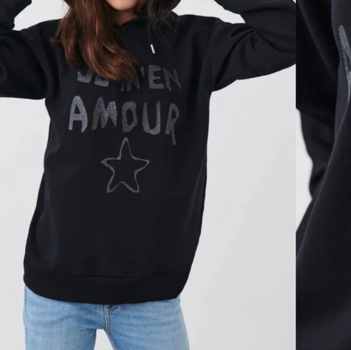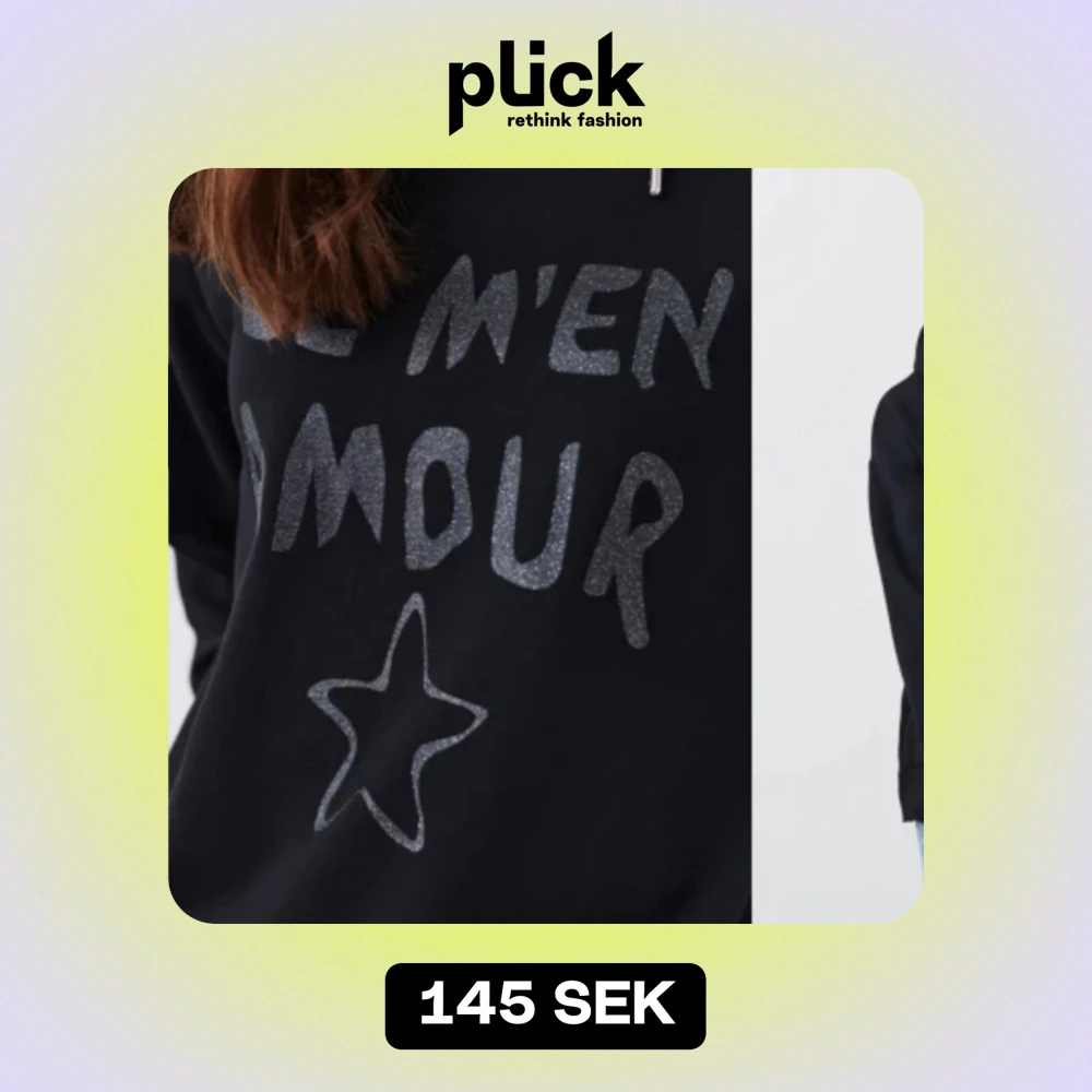 En svart hoodie med tryck från Gina tricot i storlek 146/152 den är i super bra skick och bara använd ett fåtal par gånger, hör gärna av dig vid några funderingar t.e.x bilder eller angåde priset❤️❤️❤️