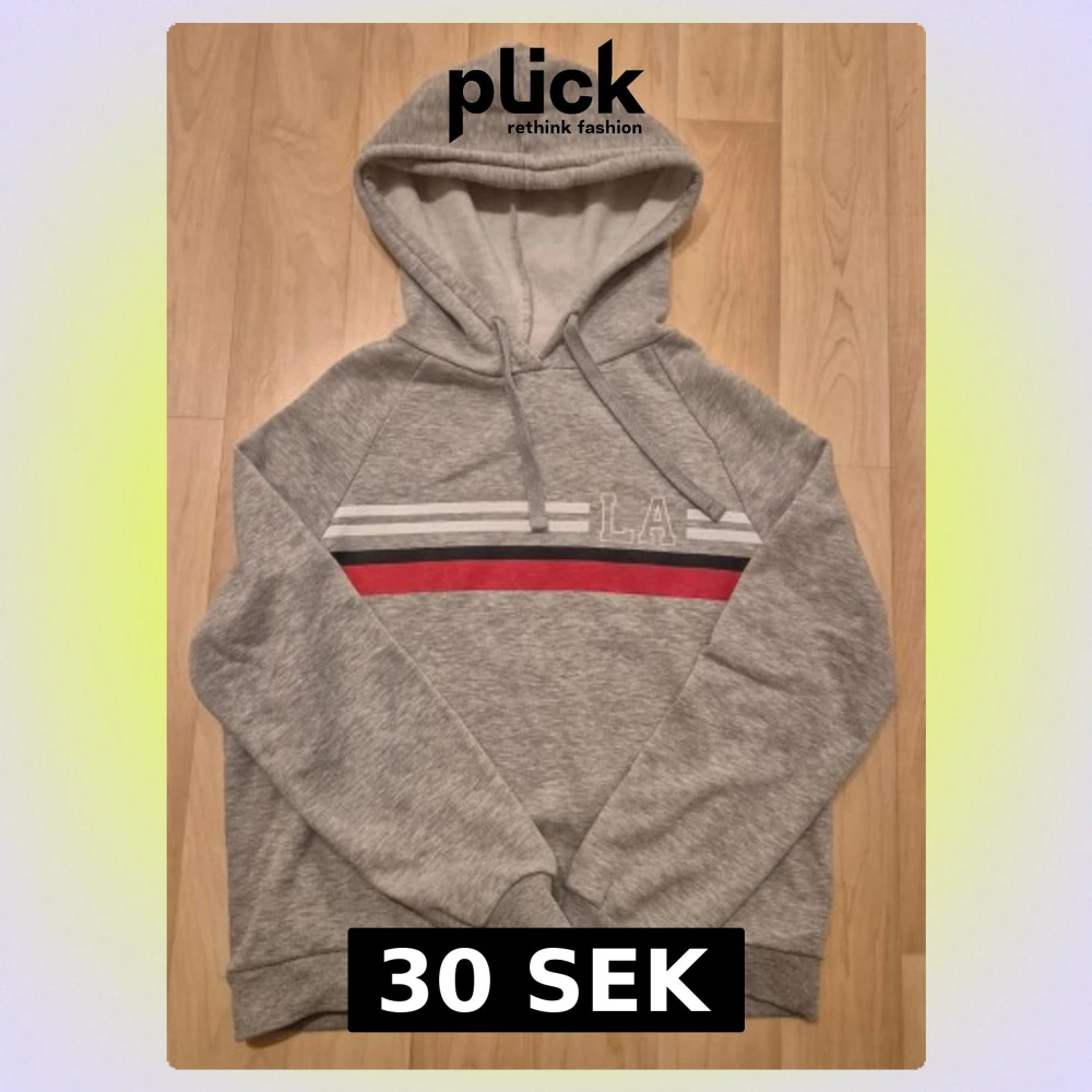 Snygg grå hoodie från Gina Tricot i storlek M. Tröjan har huva med snörning, långärmade ärmar och ett coolt LA-tryck på bröstet. Dekorerad med vita, svarta och röda ränder över bröstet. Perfekt för chill dagar och streetstyle.