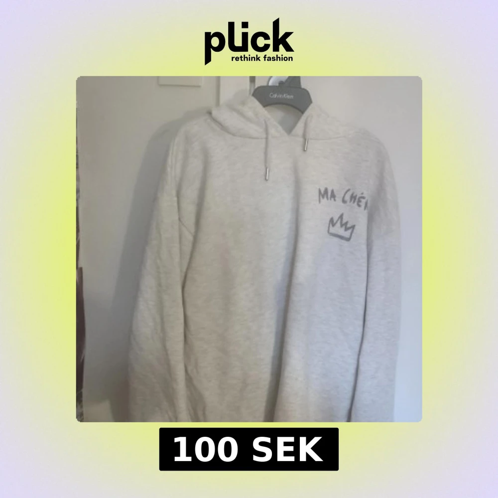 Säljer en grå hoodie från Gina Tricot med texten 'MA CHÉRIE' och en krona tryckt på framsidan. Den har en huva och är ganska skön att ha på sig (har använts 3 gånger)