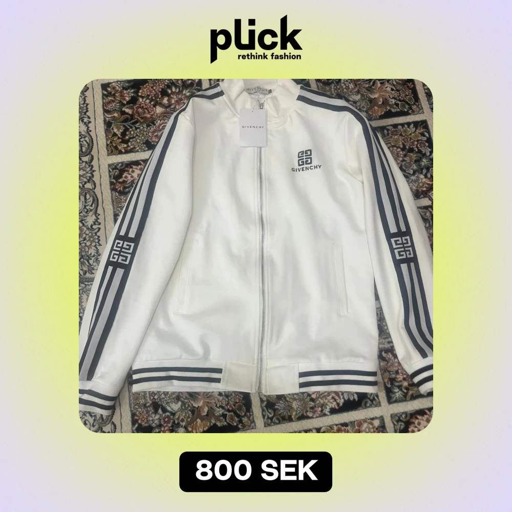 Säljer en snygg vit jacka från Givenchy med svarta detaljer. Jackan har dragkedja framtill och långa ärmar med coola ränder längs sidorna. Perfekt för en stilren look, oavsett om du ska på fest eller bara hänga med kompisar. Givenchy-loggan syns både på bröstet och ärmarna. Passar perfekt till både vardag och lite finare tillfällen!