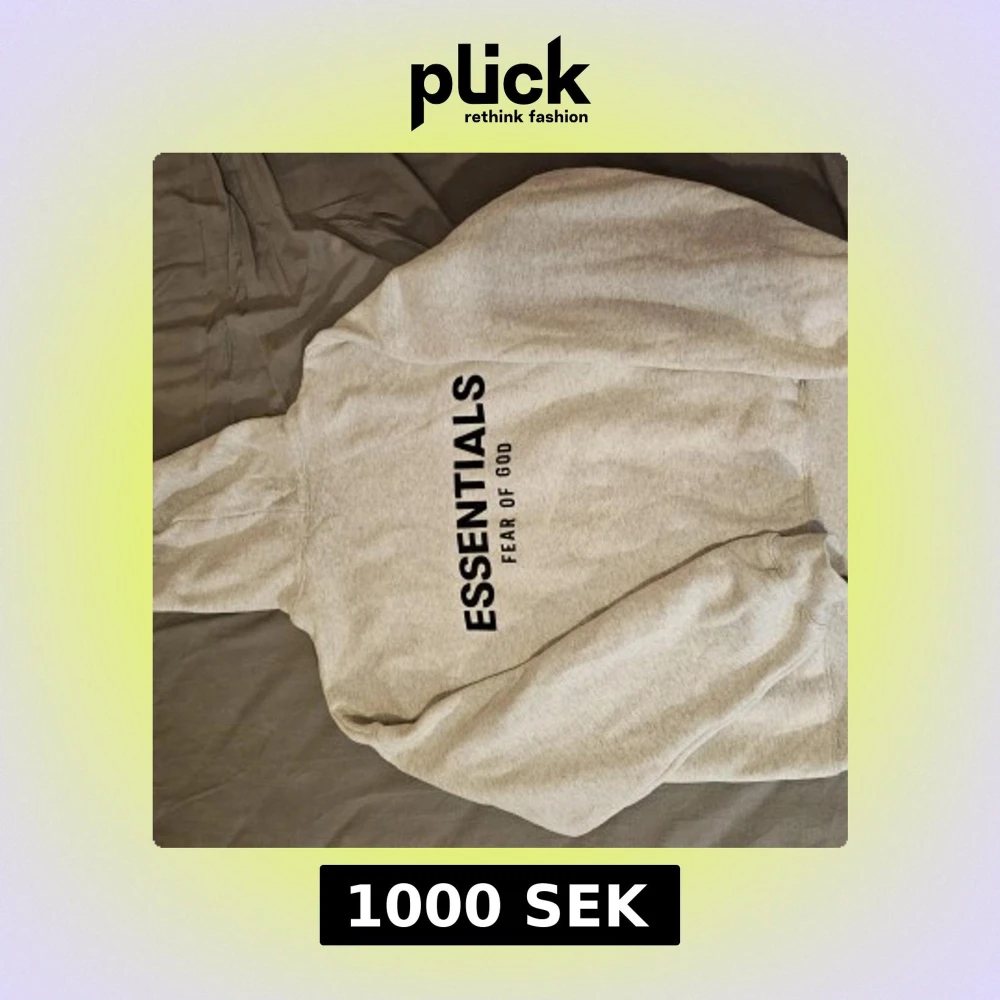 Säljer en grå hoodie från Essentials Fear of God med svart tryck både fram och bak. Klassisk känguruficka, huva och lång ärm. Perfekt för dig som gillar streetwear och vill ha en clean look.