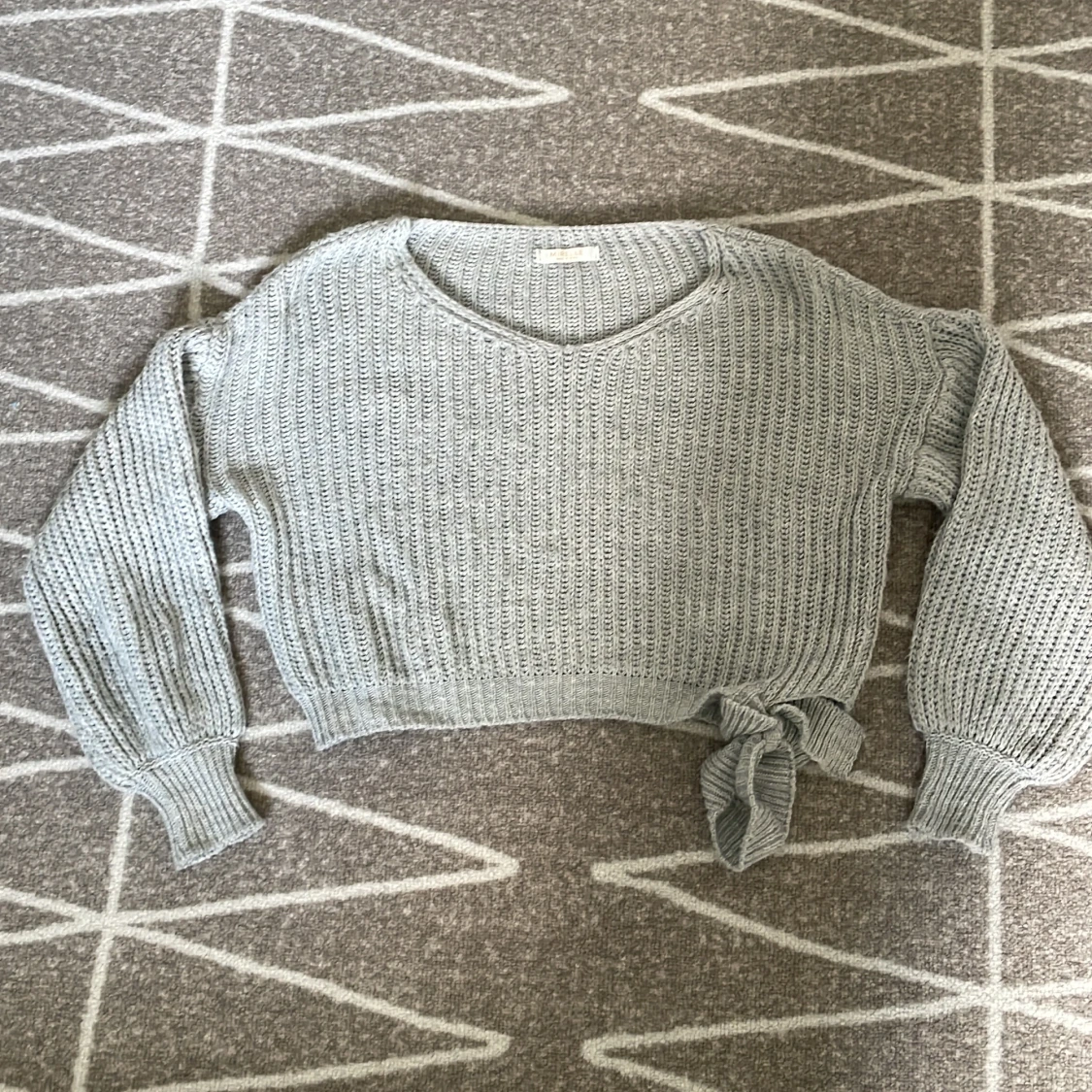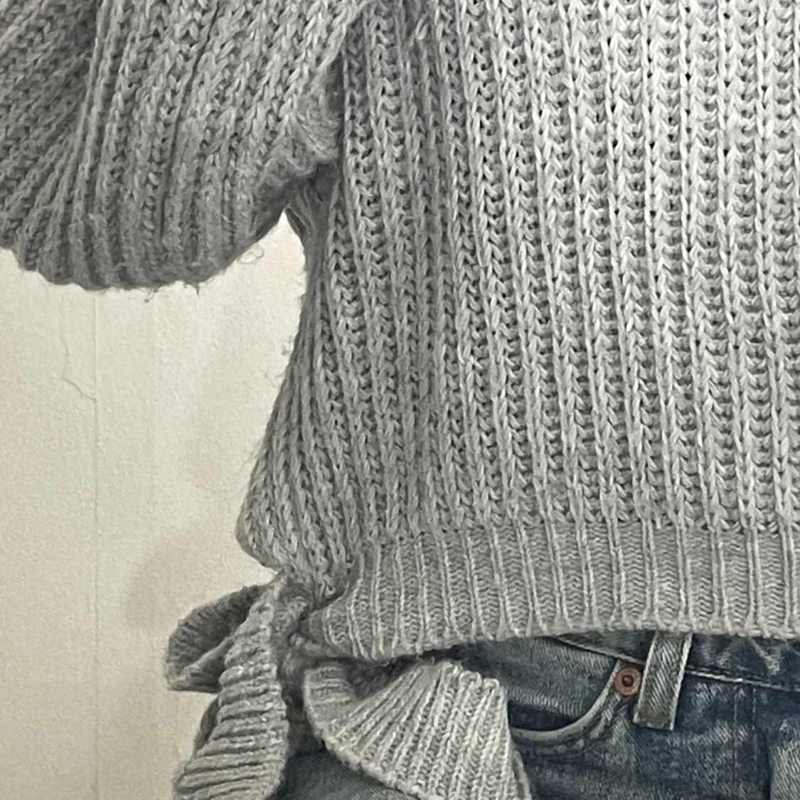 Säljer denna grå stickade tröjan som man knyter vid sidan. Använt skick. Skulle säga stl S