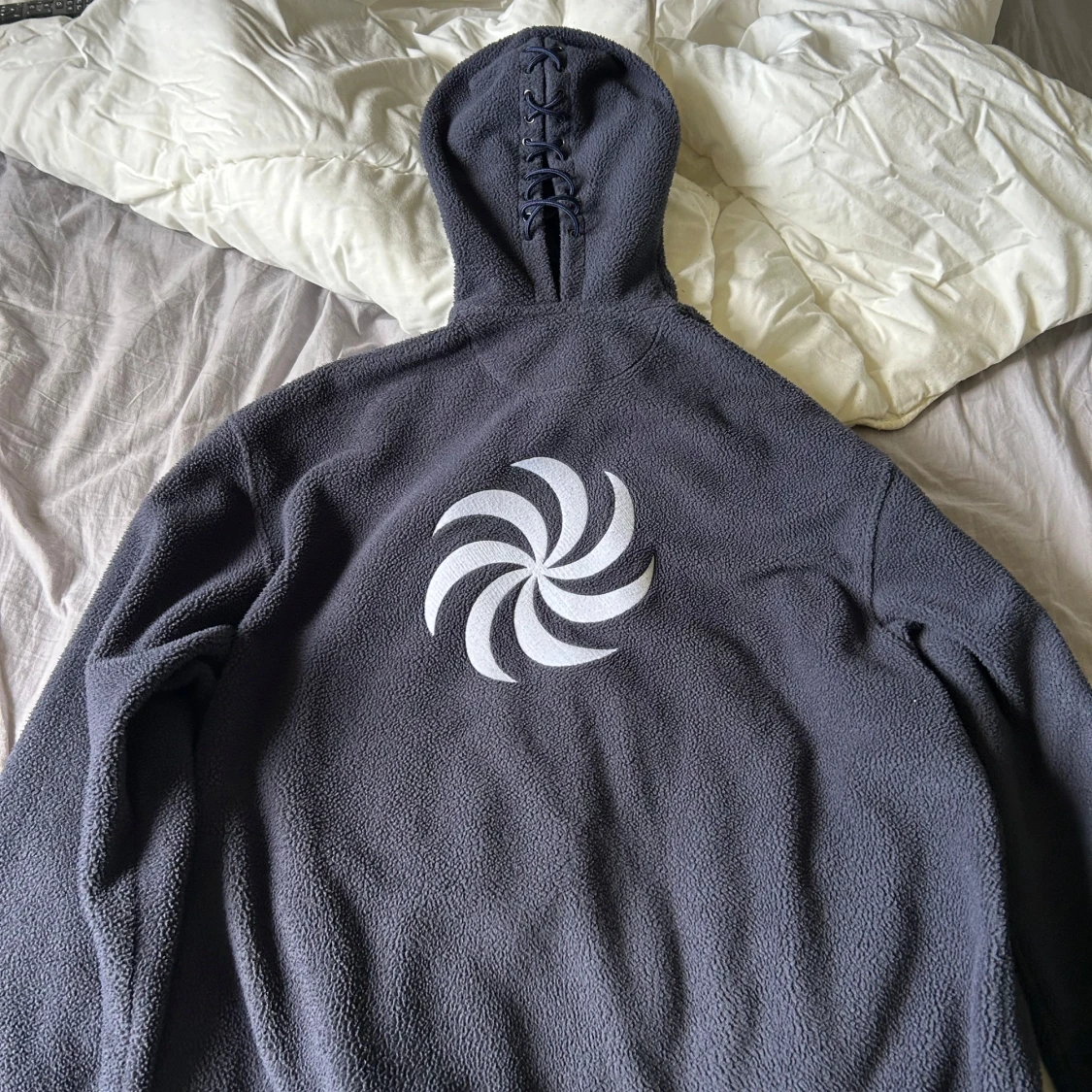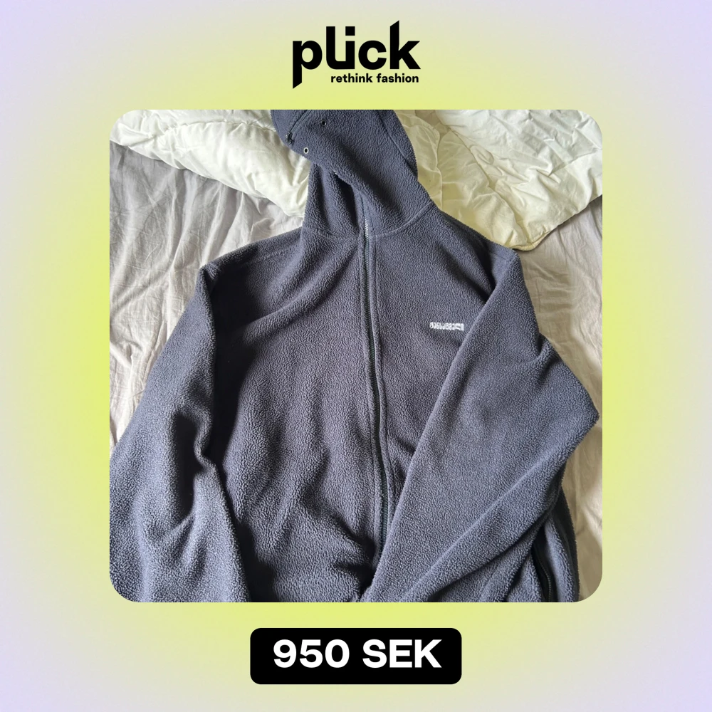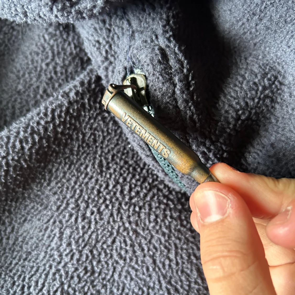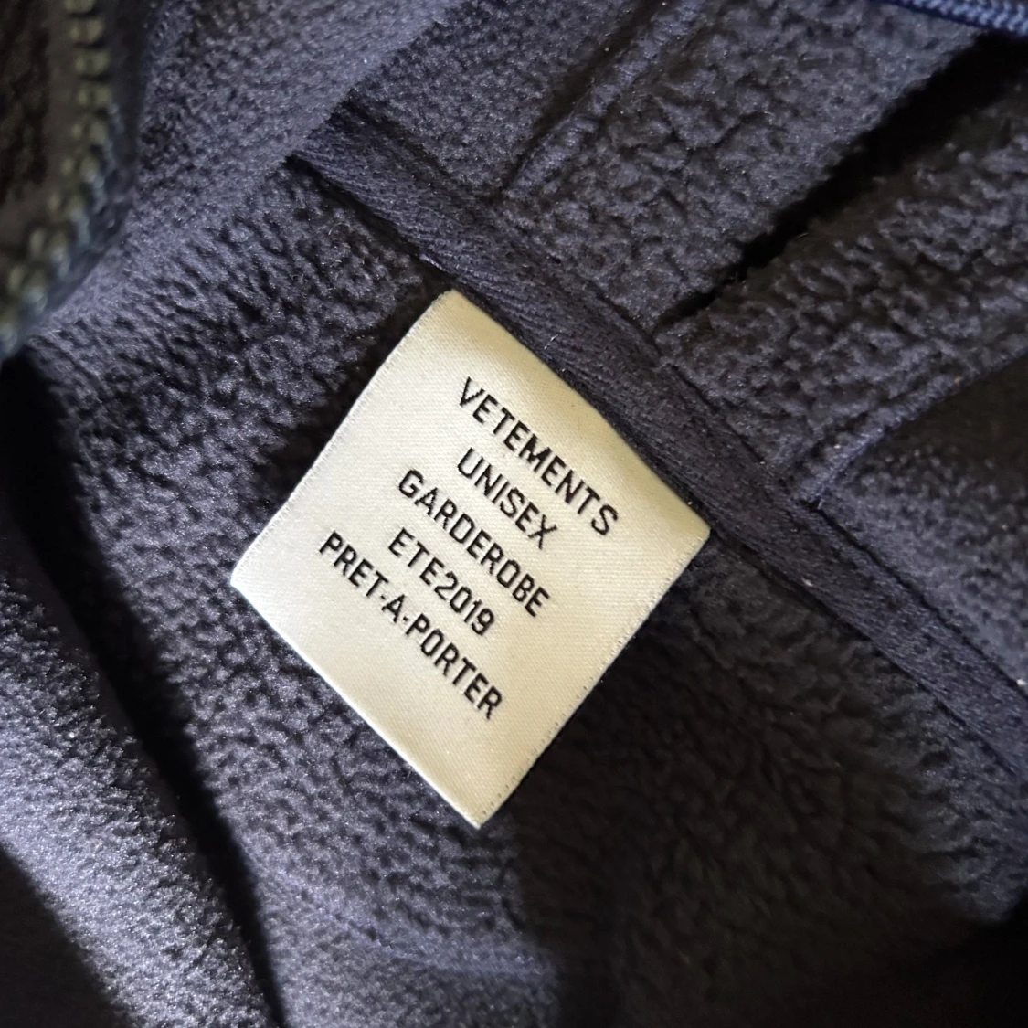 Säljer en mörkblå fleecejacka från Vetements i unisexmodell. Den har en dragkedja framtill och en cool vit logga på ryggen. Perfekt för kyliga dagar och ger en avslappnad stil. Jackan är i mycket bra skick och passar både höst och vår.