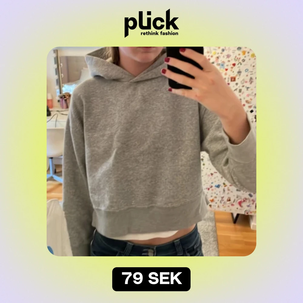 Det är en ljus grå tjocktröja med luva. Tröjan är utan snören och väldigt fin! Fint skick och material