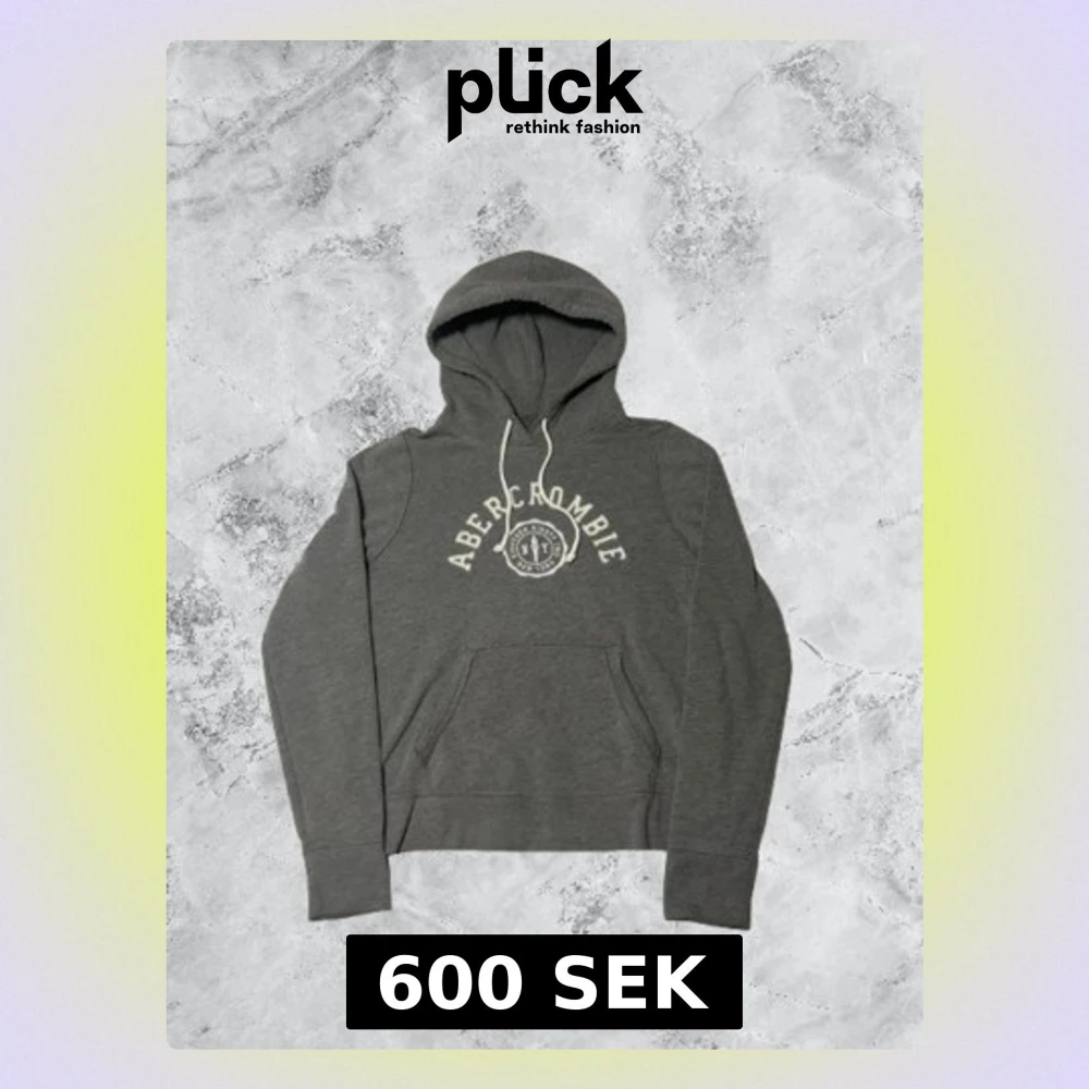 Snygg grå hoodie från Abercrombie & Fitch i storlek S. Tröjan har vit logotyp framtill, huva med snörning och en klassisk känguruficka. Mjuk bomullsmix som är perfekt för chill dagar. Stilren och enkel att matcha med.