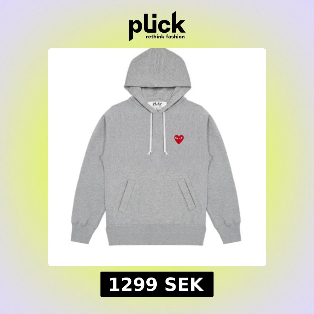 Grå hoodie från Comme des Garçons Play med klassisk huva och snörning. På bröstet sitter det ikoniska röda hjärtat med ögon. Tröjan har känguruficka och ribbade muddar. Perfekt för chill dagar och streetwear vibes. Kvitto finns