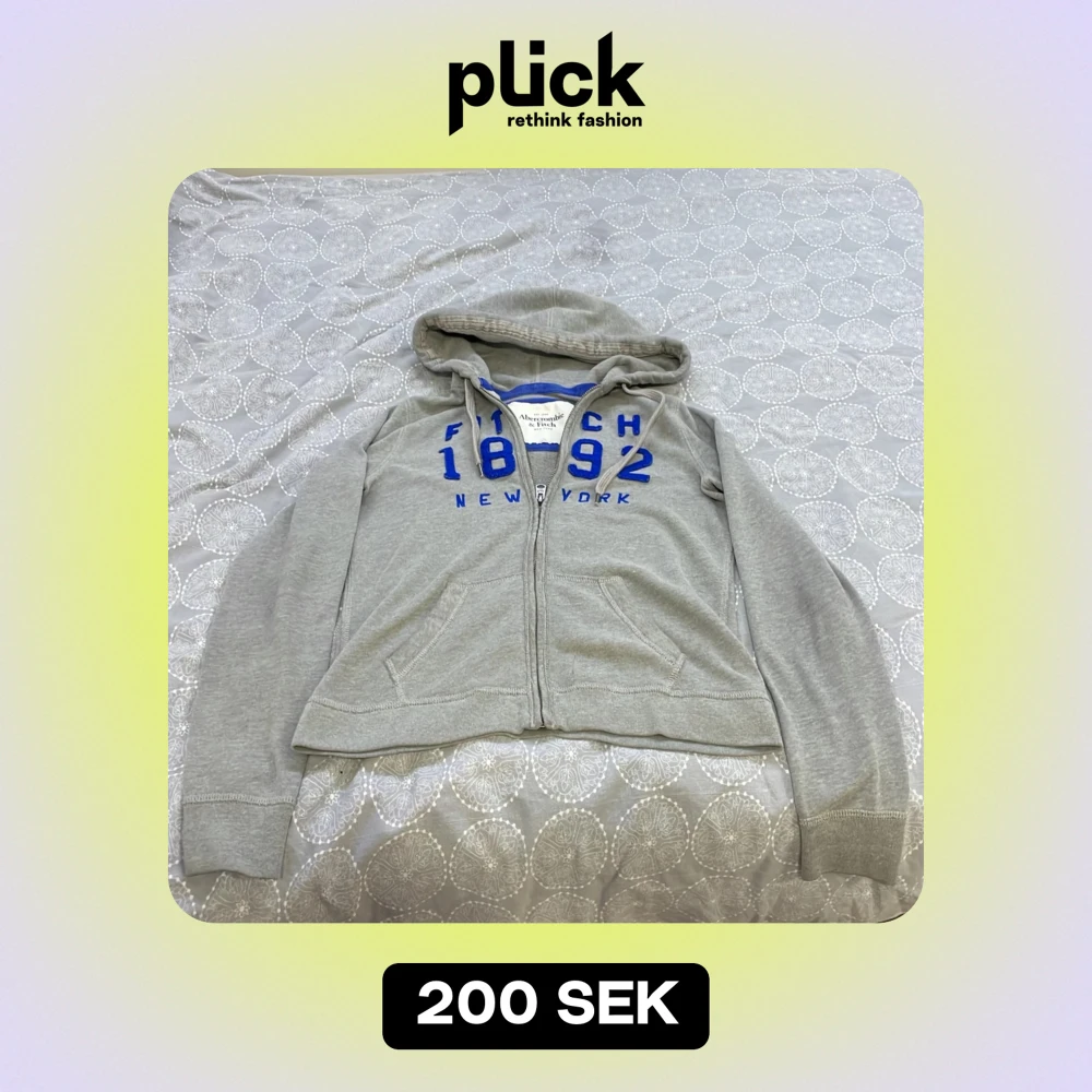 Säljer en snygg grå hoodie från Abercrombie & Fitch med blå text 'Fitch 1892 New York' på framsidan. Den har en dragkedja och är i bra skick. Perfekt för en avslappnad stil eller kyliga dagar. 🧢