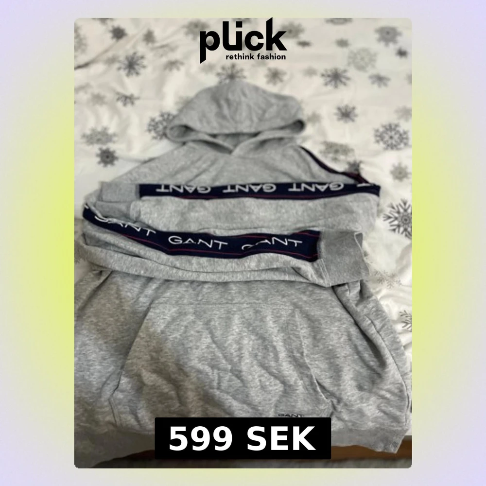 Säljer en grå hoodie från GANT med huva och breda logoband längs ärmarna. Tröjan har en stor magficka och ribbade muddar. Perfekt för chill dagar och har en snygg, sportig vibe med tydlig GANT-branding.