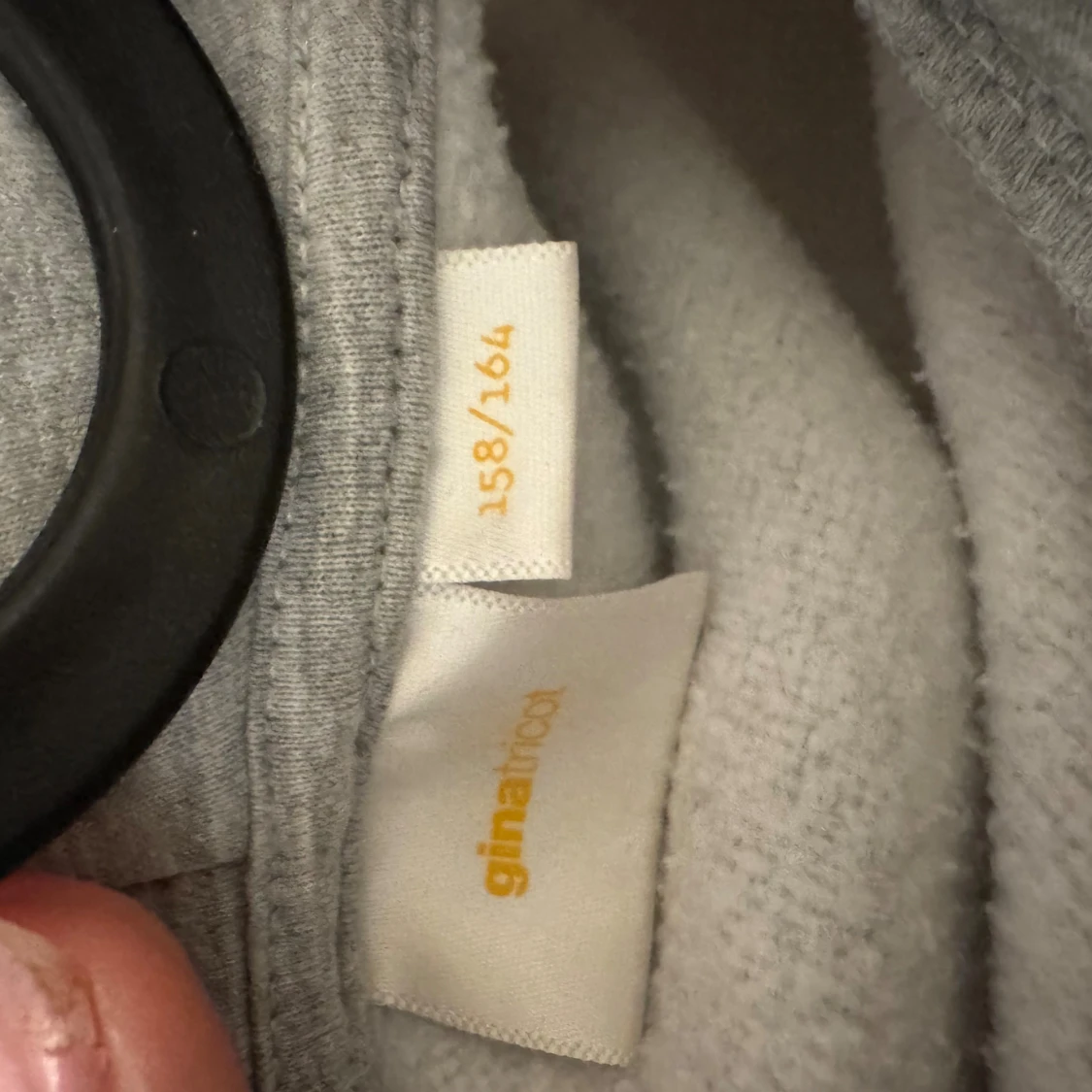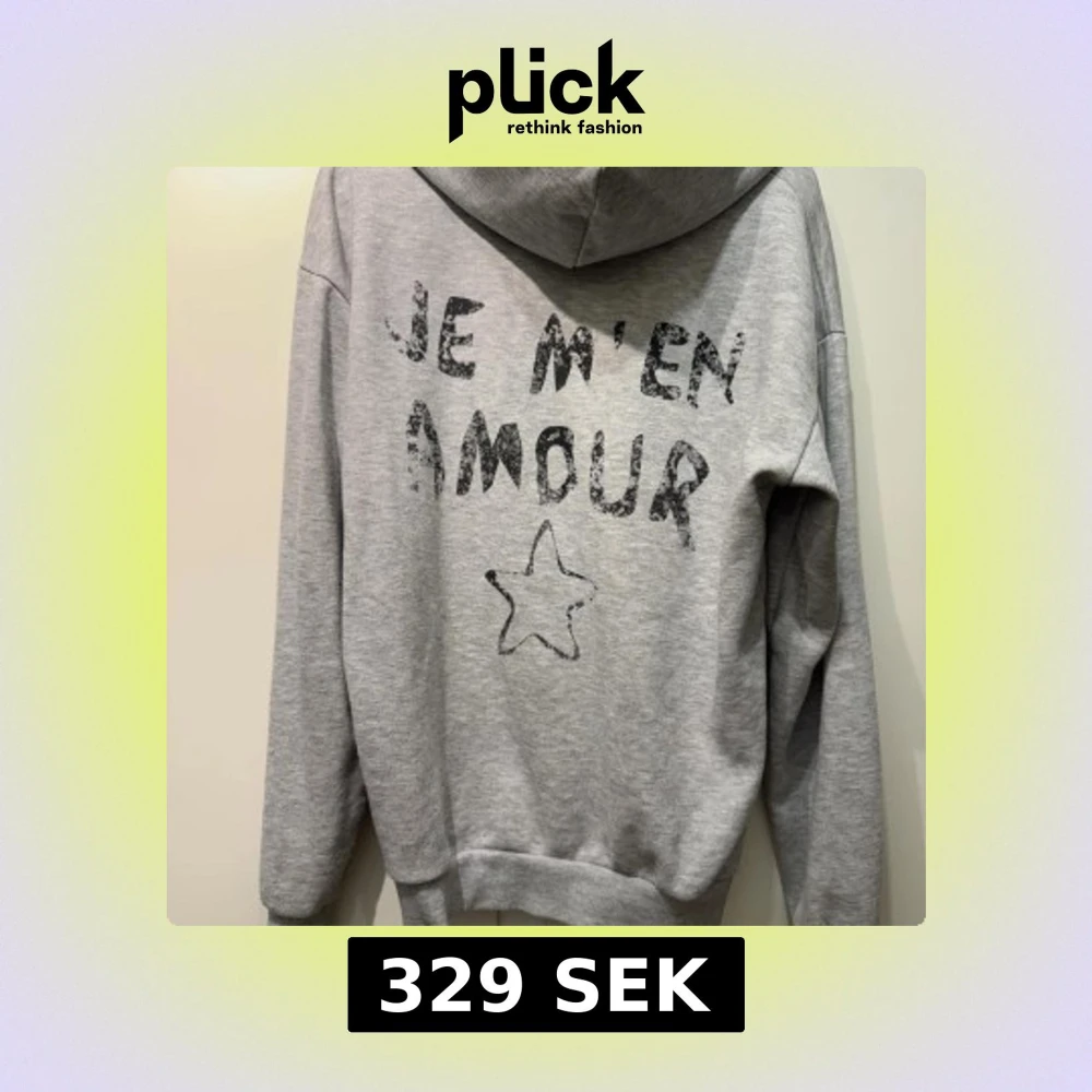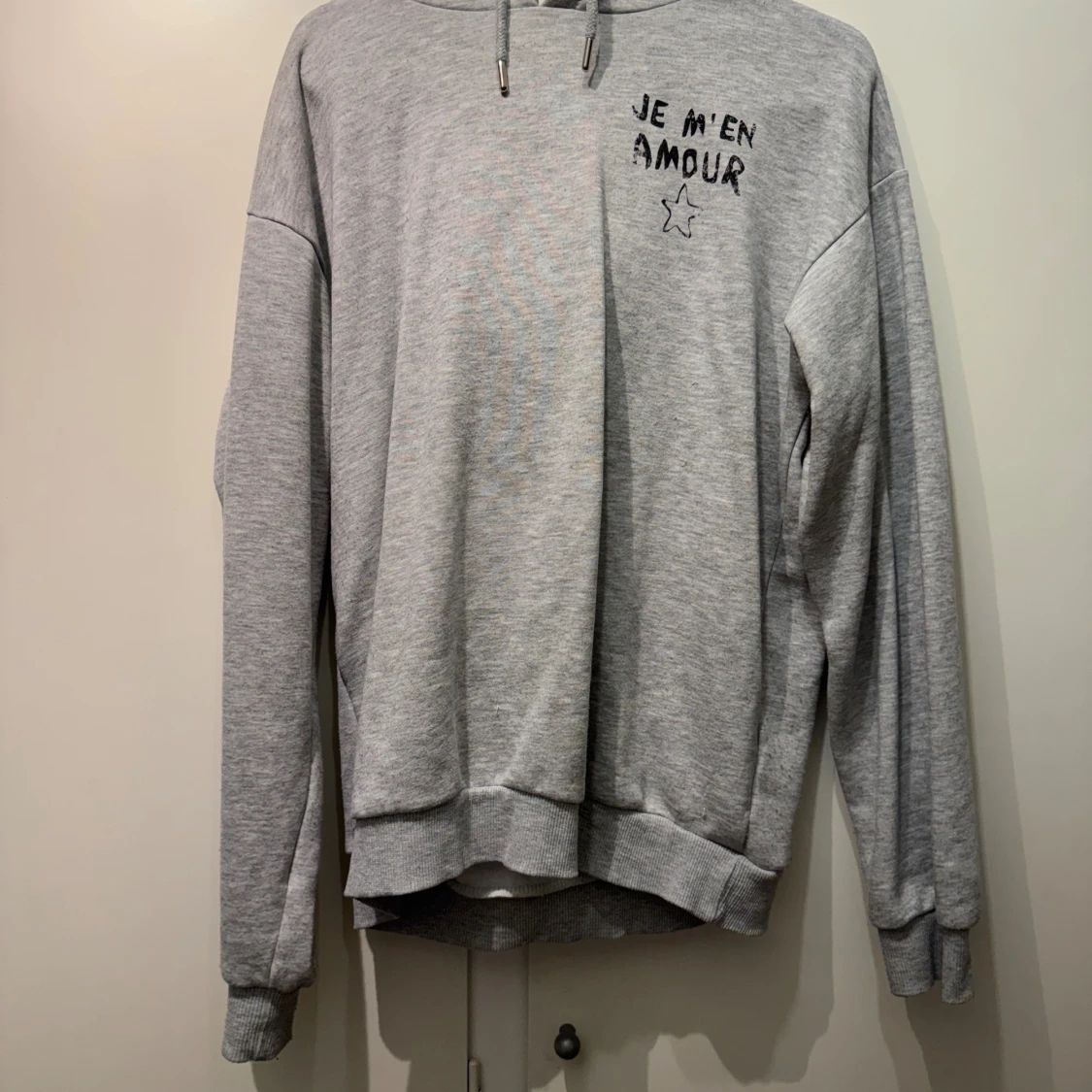 Grå hoodie från Gina Tricot med svart texttryck 'Je m'en amour' och en stjärna både fram och bak. Använd typ 3 gånger i storlek 158-164 men käns större