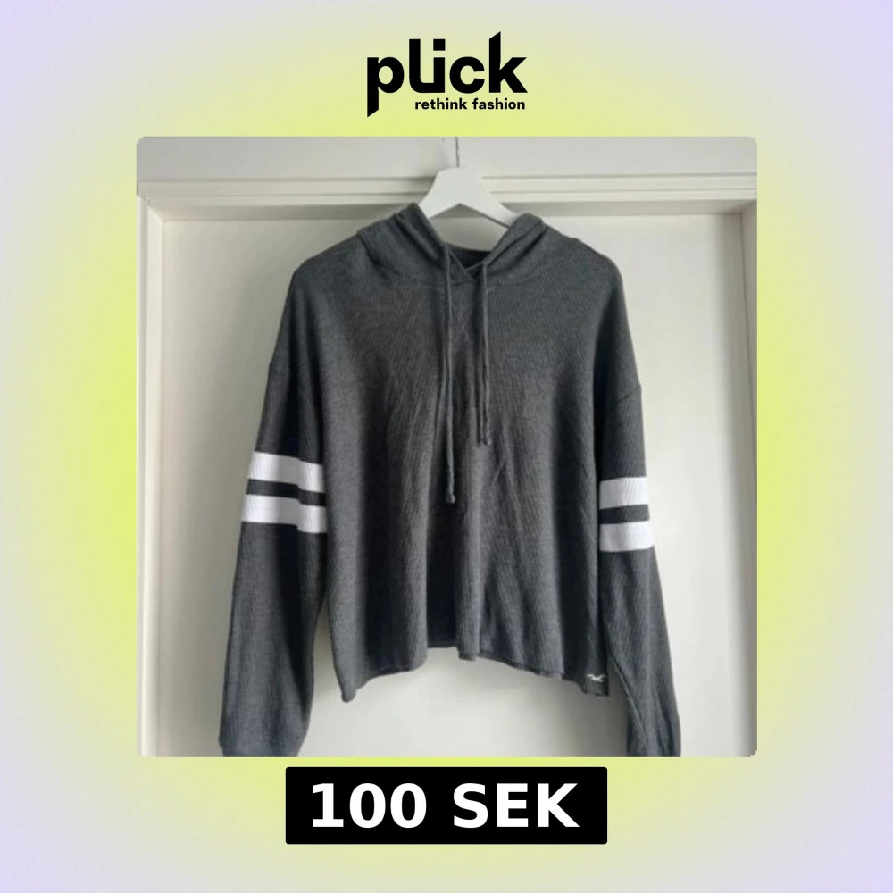Grå ribbad hoodie från Hollister Must-Have Collection. Croppad modell med huva och snörning, vita dubbla ränder på ärmarna och lång ärm. Liten broderad logga nertill. Perfekt för en chill och sportig look.
