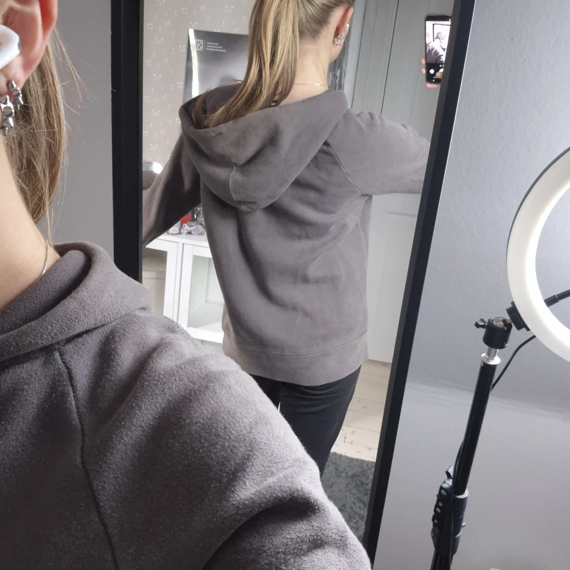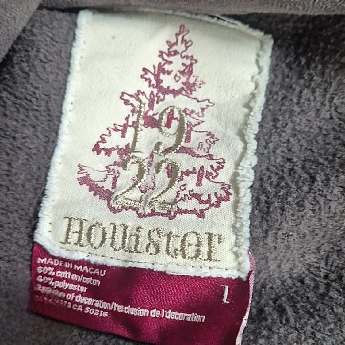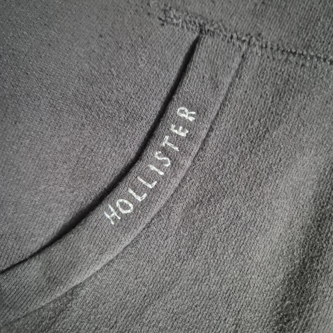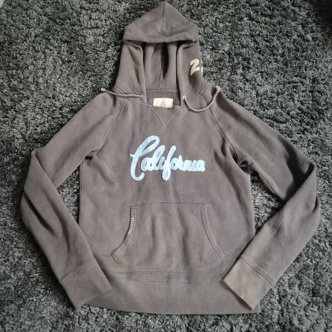 Säljer en grå hoodie från Hollister med ljusblått 'California'-tryck på bröstet och broderad Hollister-logga vid fickan. Tröjan har huva med snörning, magficka och långa ärmar. Perfekt för chill dagar och sköna outfits.