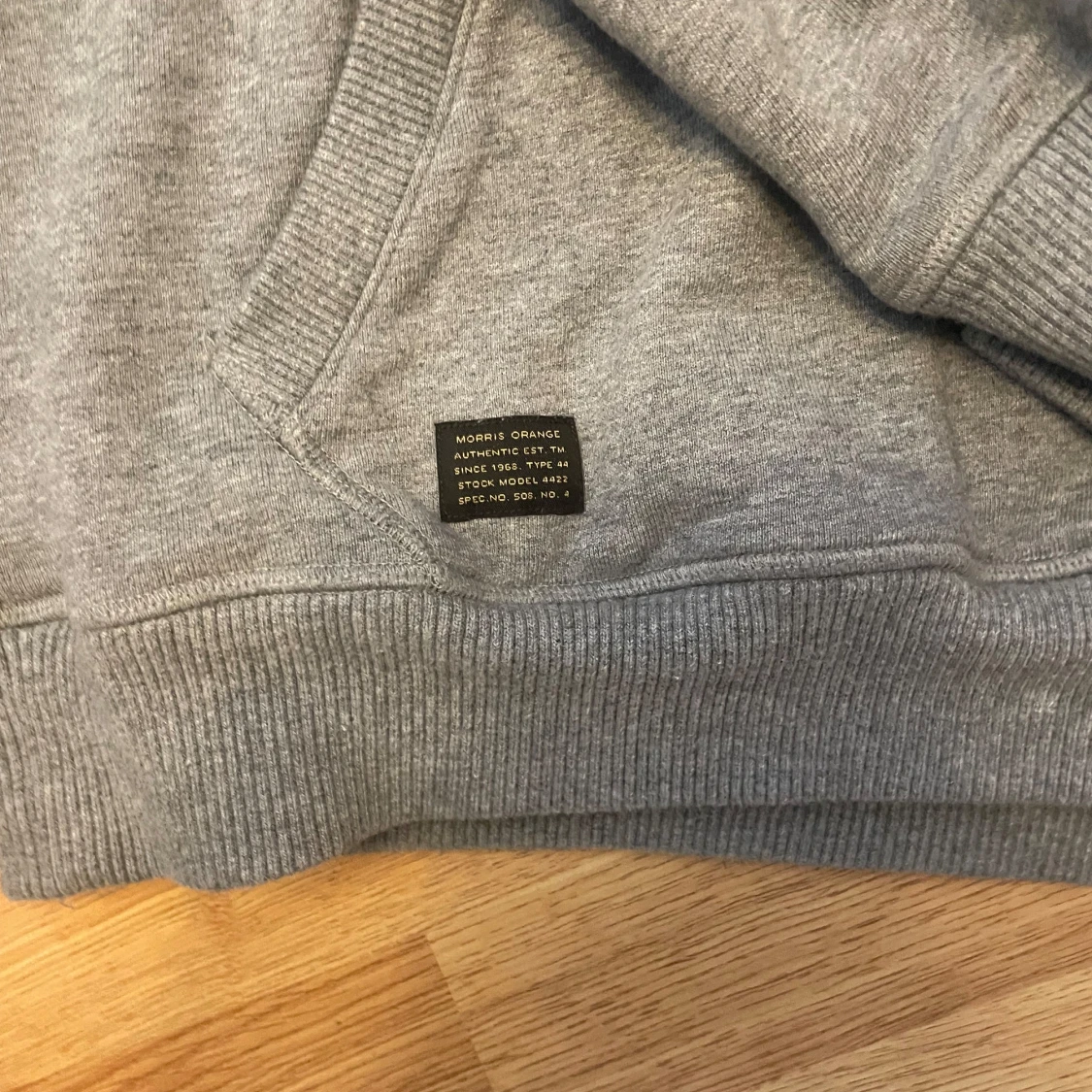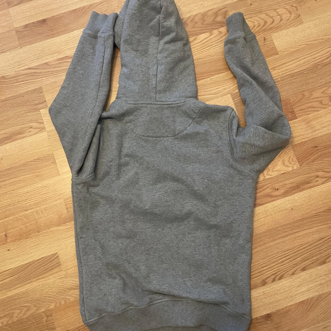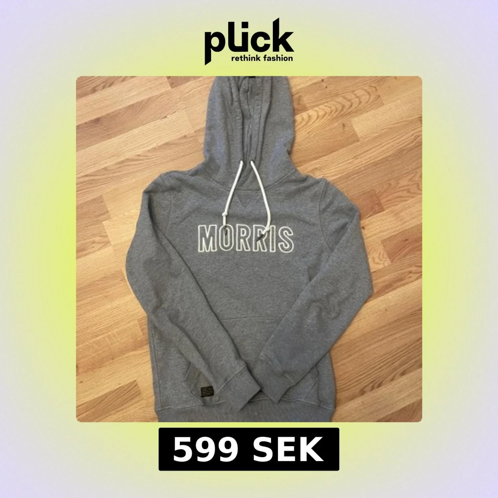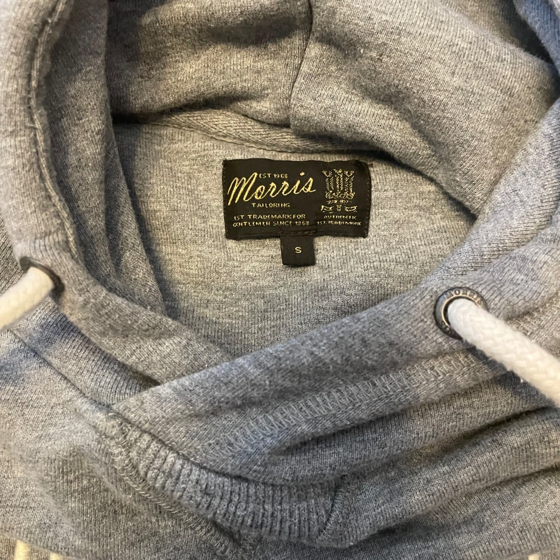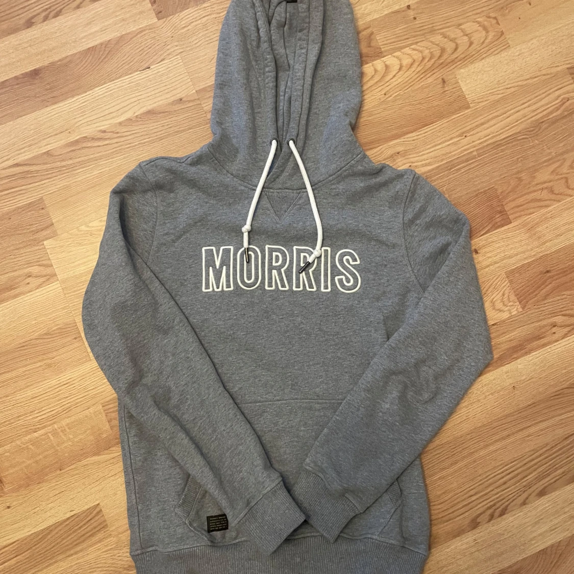 Grå hoodie från Morris med vit broderad logga på bröstet och vita snören i huvan. Klassisk känguruficka framtill och ribbade muddar. Mjuk och skön i bomullsblandning, perfekt för chill dagar.