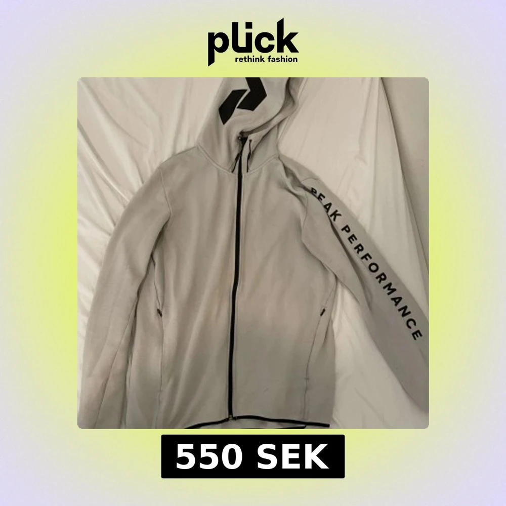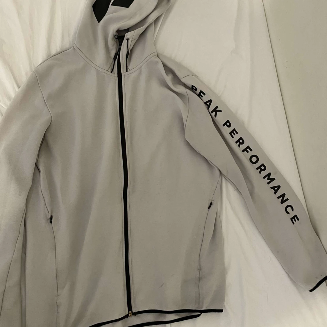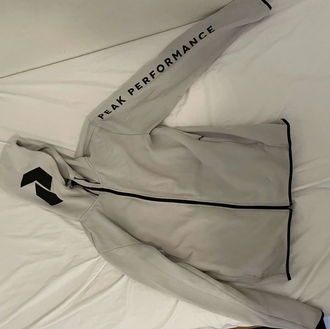 Säljer en stilren grå hoodie från Peak Performance med svart dragkedja och tryck på ärmen. Den har en justerbar huva och två praktiska fickor med dragkedja. Perfekt för en avslappnad stil. Och nyligen köpt priset kan diskuteras