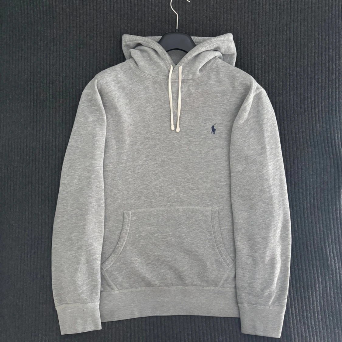 Klassisk grå hoodie från Polo Ralph Lauren med vit snörning i huvan och mörkblå broderad logga på bröstet. Tröjan har känguruficka, ribbade muddar och är tillverkad i mjuk bomullsmix. Perfekt för en chill och stilren look.