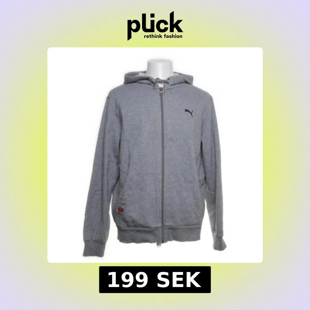 Säljer en grå hoodie från Puma med dragkedja och huva. Den har en liten svart logga på bröstet och praktiska fickor framtill. Perfekt för en avslappnad stil.