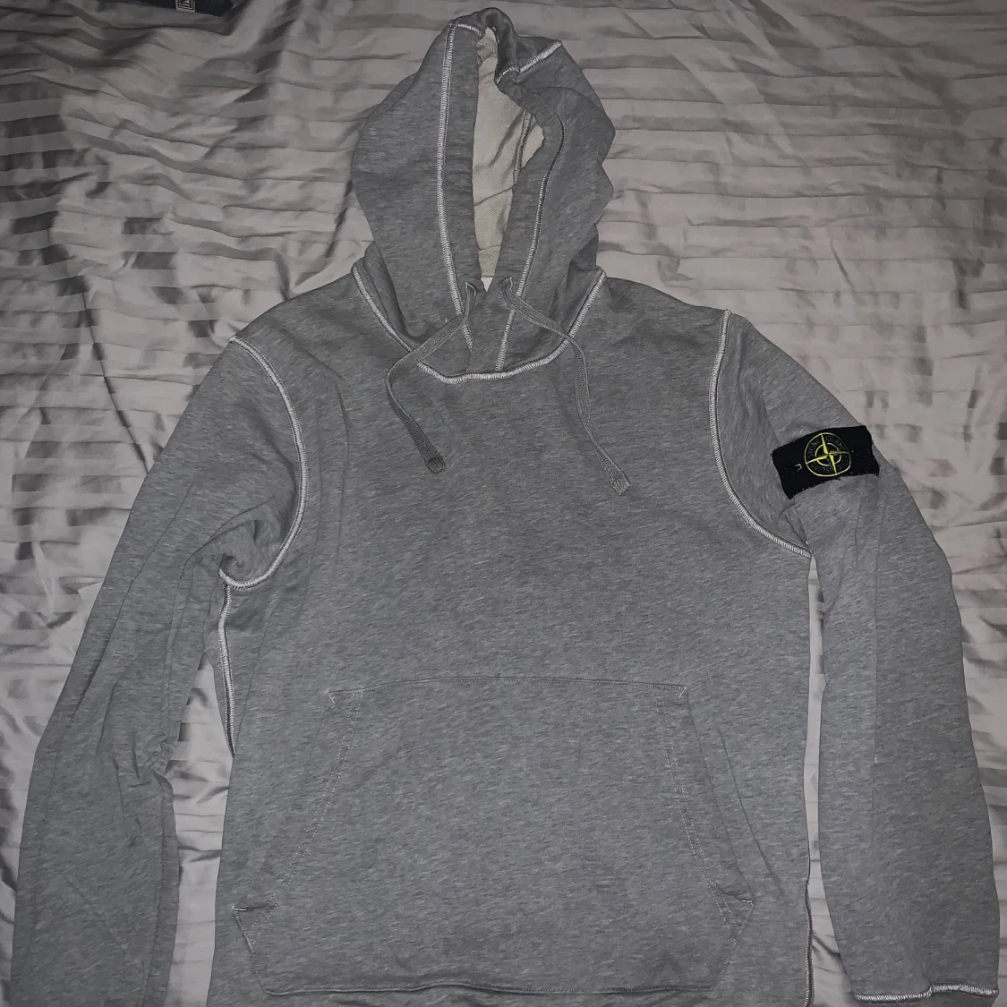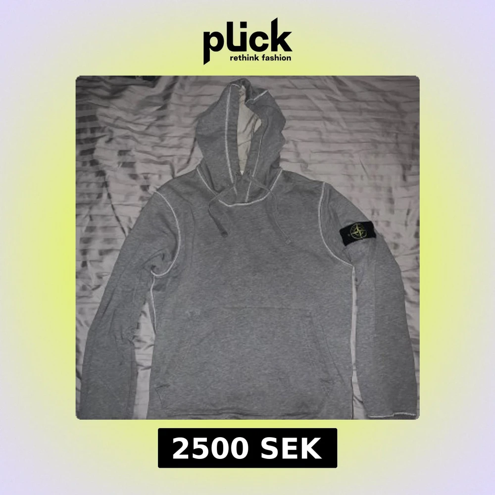 Äkthetsbevis från Stone Island finns. Snygg grå hoodie från Stone Island med klassisk patch på ärmen. Tröjan har huva med snörning, känguruficka och vita kontrastsömmar. Tillverkad i mjuk bomull som känns skön mot huden. Perfekt för dig som gillar streetwear och vill ha en stilren look.