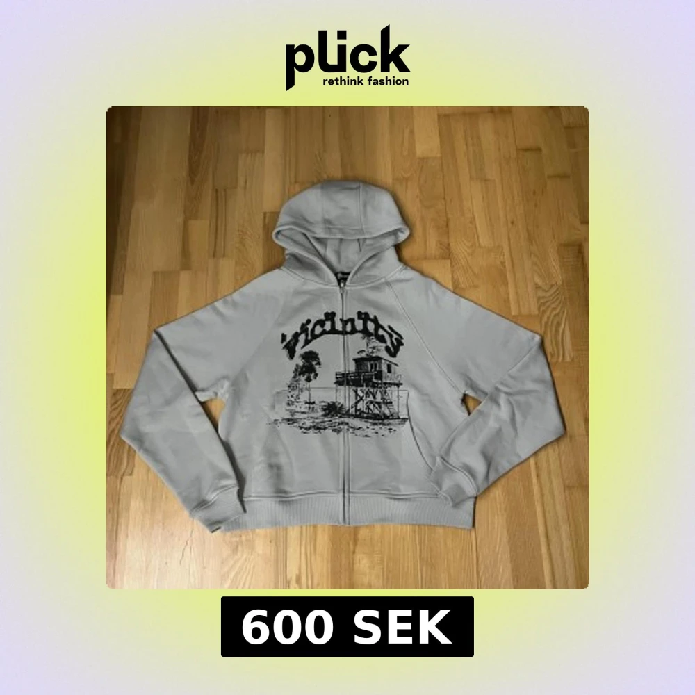 Säljer en grå hoodie från Vicinity med dragkedja och tryck av en stuga och träd på framsidan. Perfekt för en avslappnad stil. Hoodien har långa ärmar och en bekväm passform.