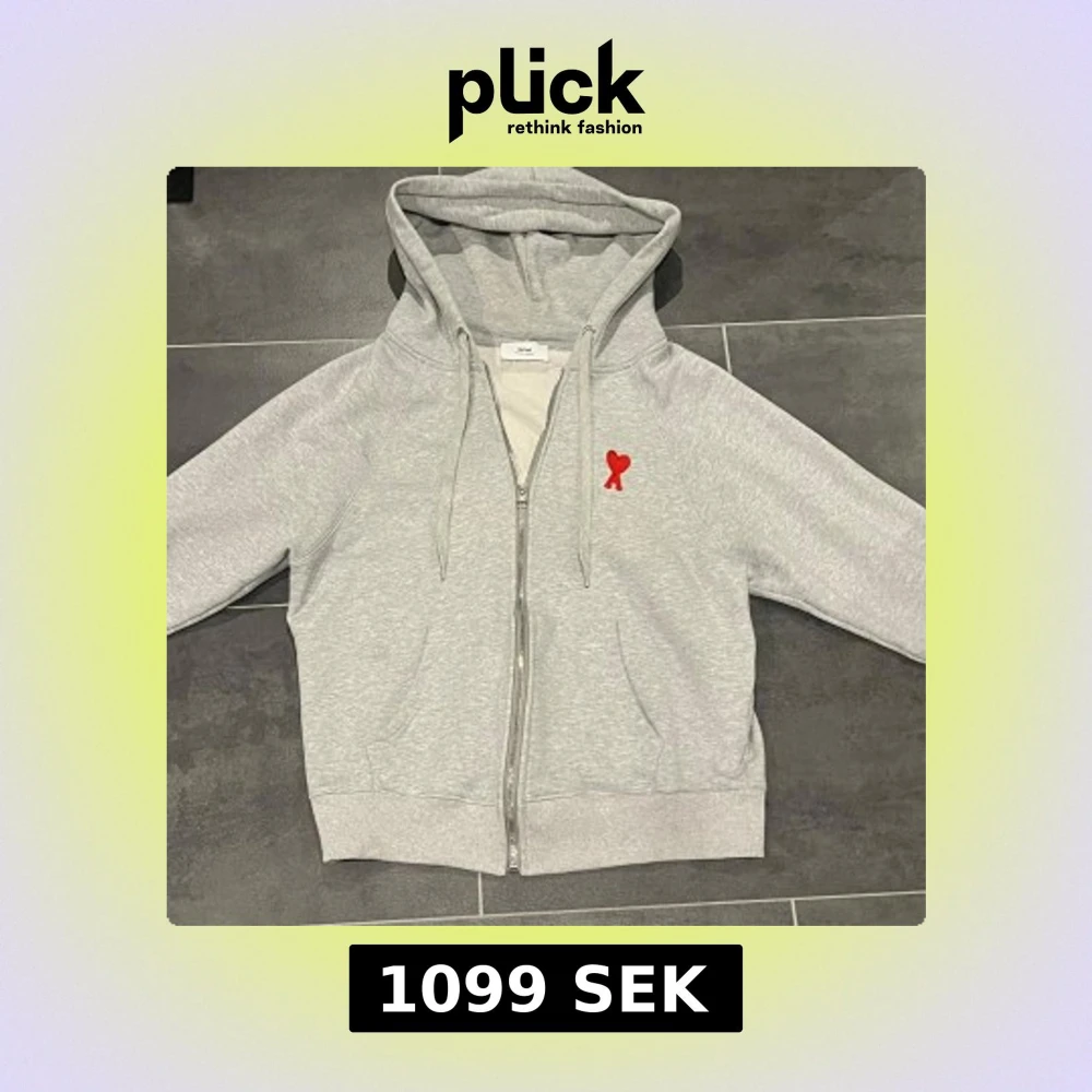Säljer en grå hoodie från Ami med dragkedja och huva. Jackan har en röd broderad logga på bröstet, två fickor fram och ribbade muddar. Perfekt för en avslappnad stil.