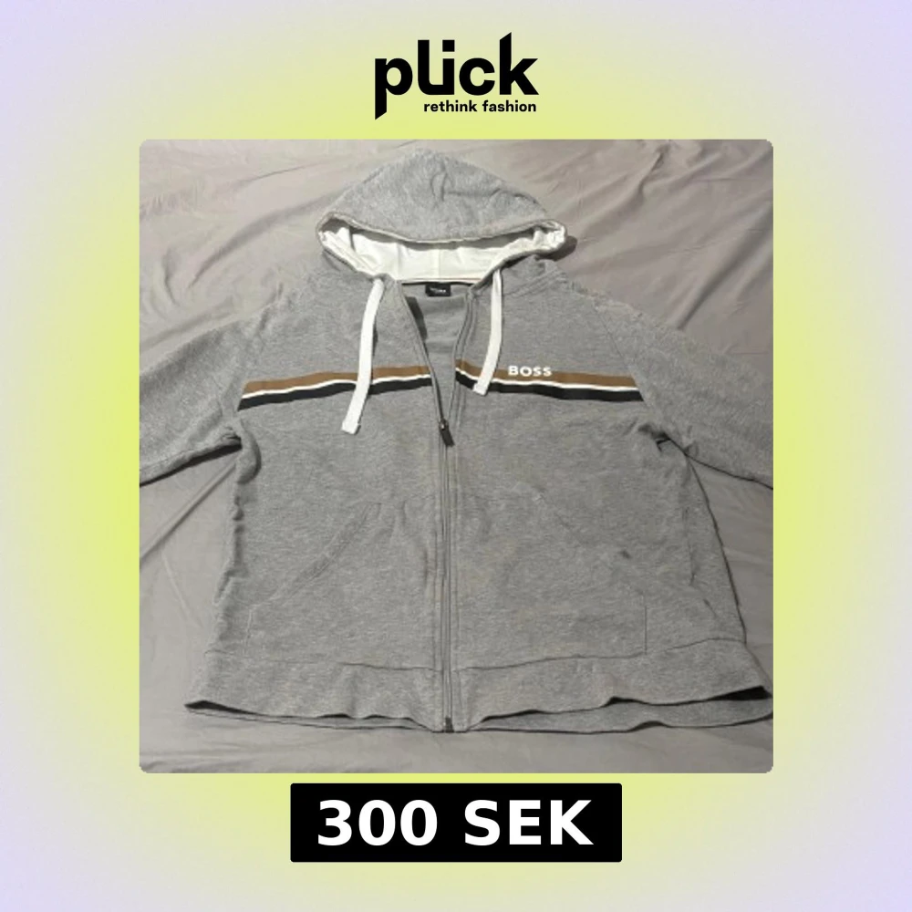 Grå hoodie från BOSS med dragkedja framtill och huva med vita snören. Brunt, vitt och svart band över bröstet samt BOSS-logga. Perfekt för en avslappnad stil. Köpt för 1200kr