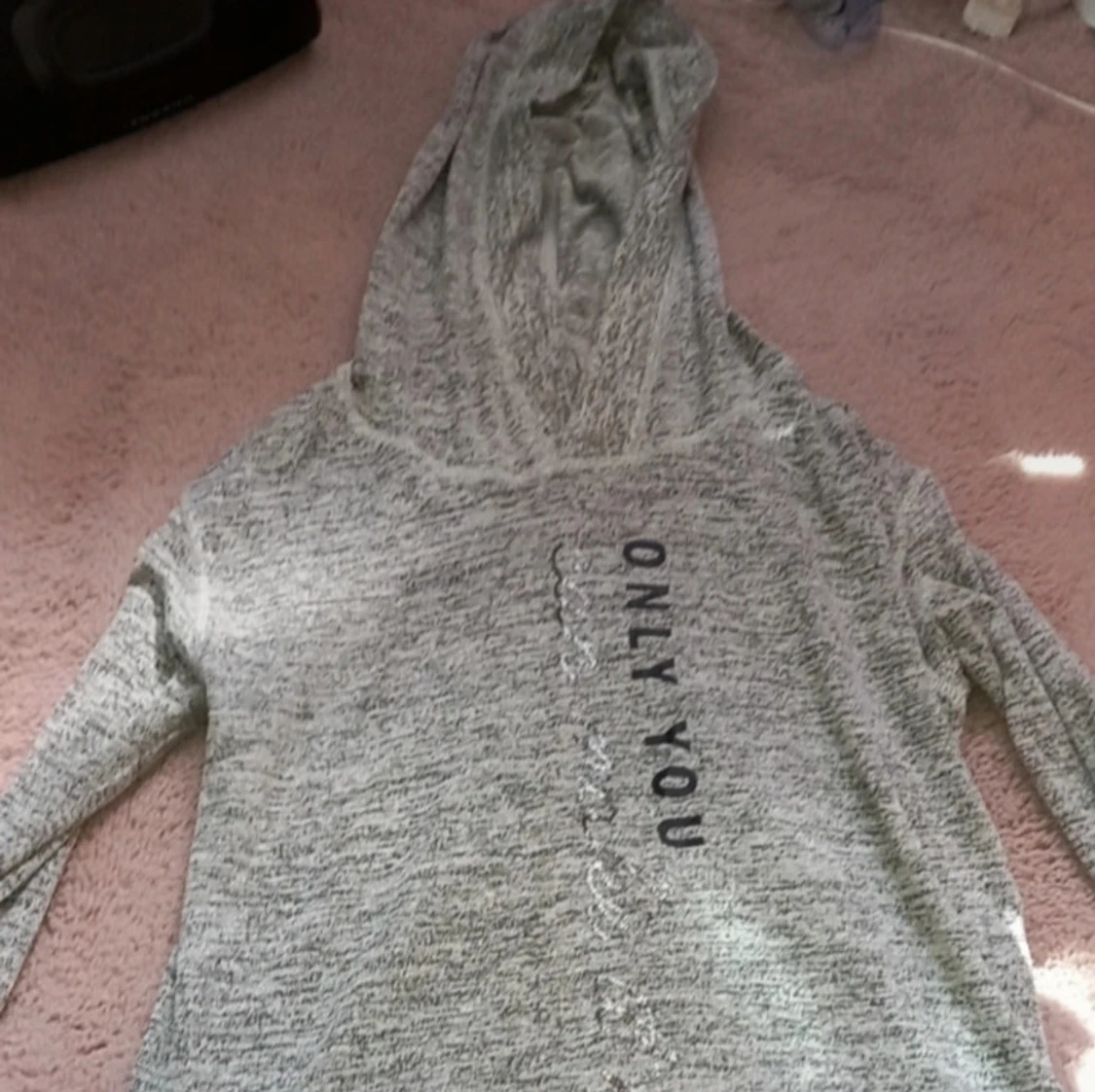 Säljer en grå hoodie med texten 'ONLY YOU' tryckt på framsidan. Tröjan har långa ärmar och en bekväm huva. Perfekt för en avslappnad stil.