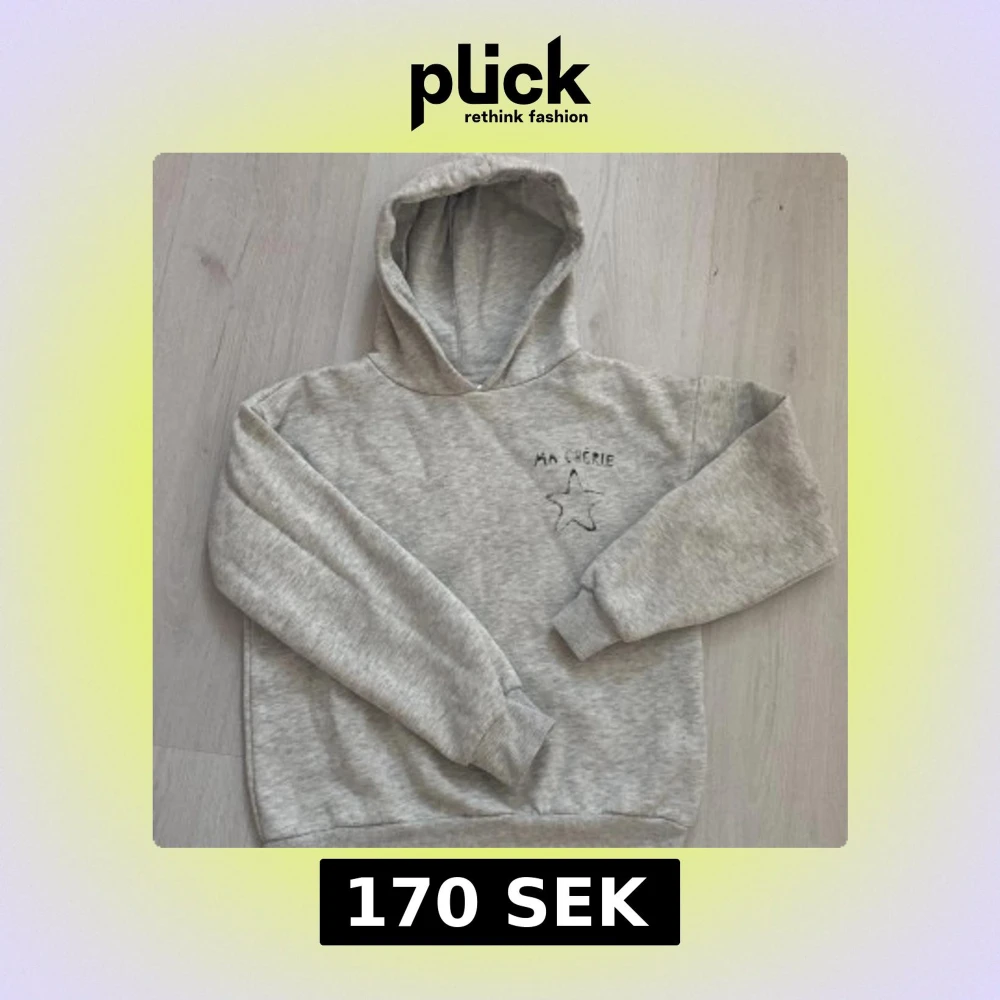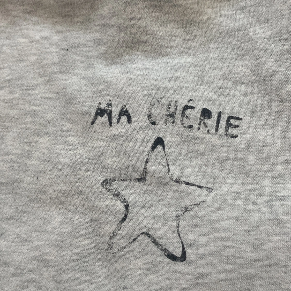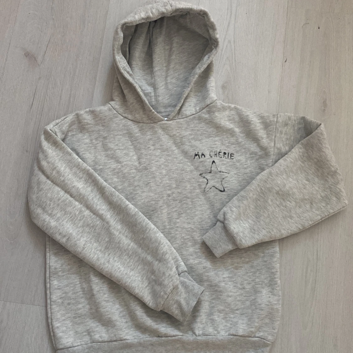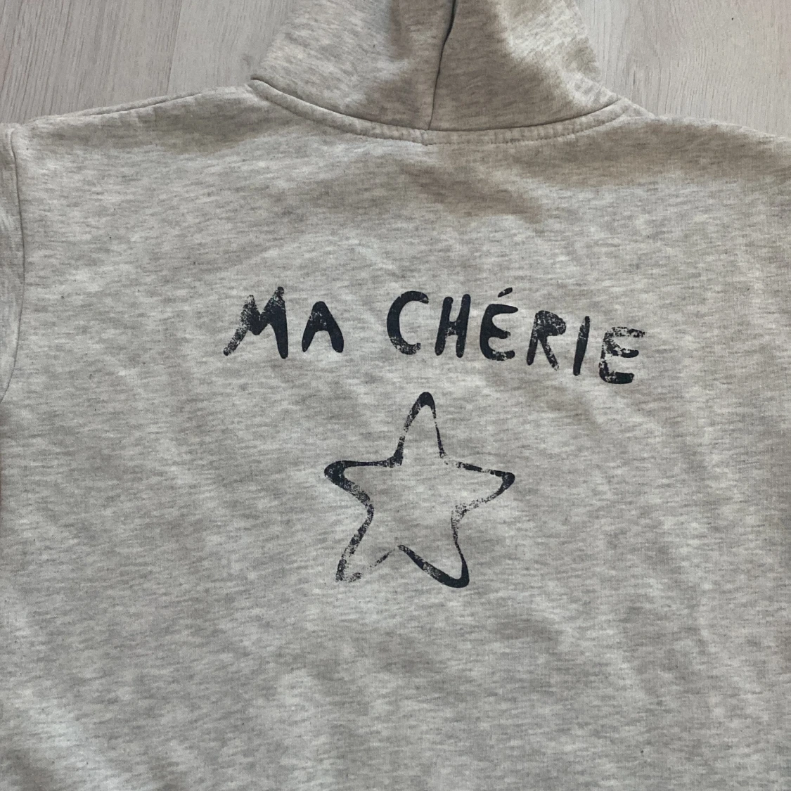 Säljer en mysig grå hoodie med texten 'Ma Chérie' och en stjärna tryckt på bröstet. Tröjan har en klassisk huva och ribbade muddar vid ärmslut och nederkant. Perfekt till vardags