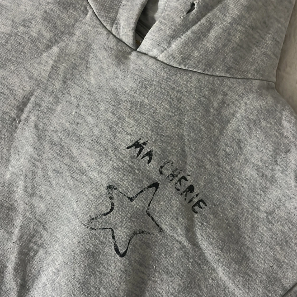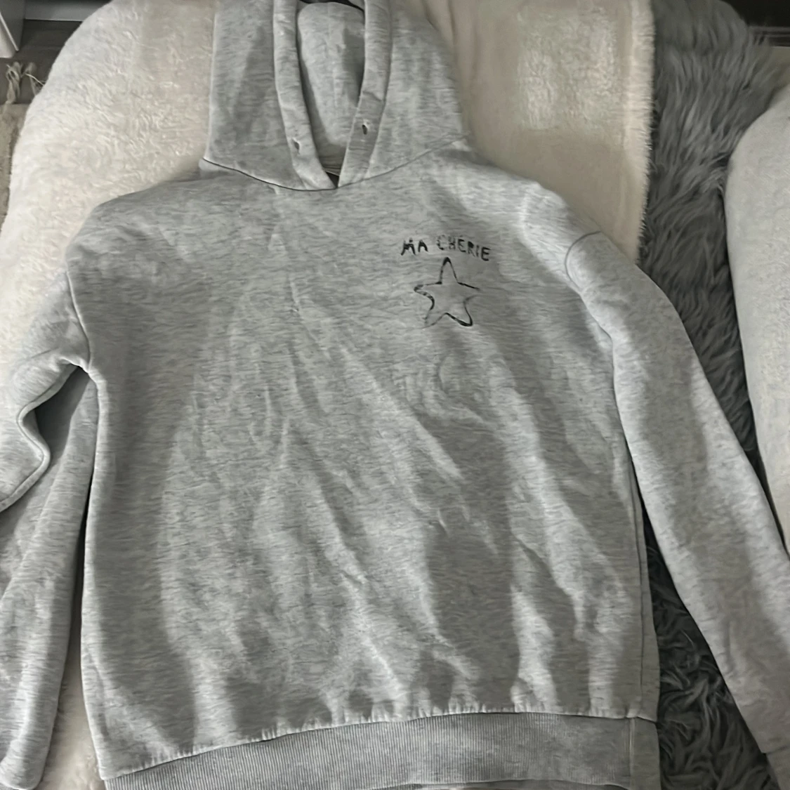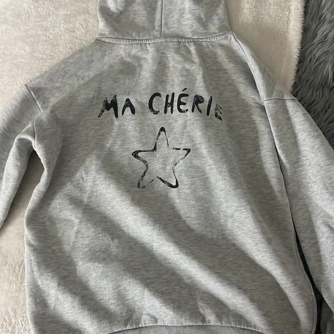 Säljer en ljusgrå hoodie med svart tryck 'Ma Chérie' och en stjärna både fram och bak. Tröjan har huva, långa ärmar och ribbade muddar vid ärmslut och nederkant. Perfekt för sig som exempelvis gillar Hov1💕STORLEK 146/152. Lite knott o sånt men annars i bra skick! Nästan aldrig använt❣️Saknar snören.