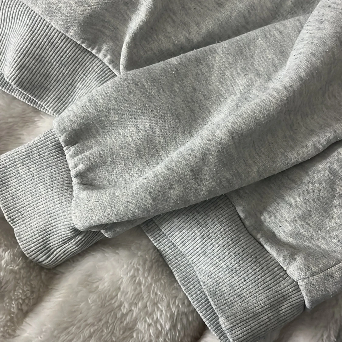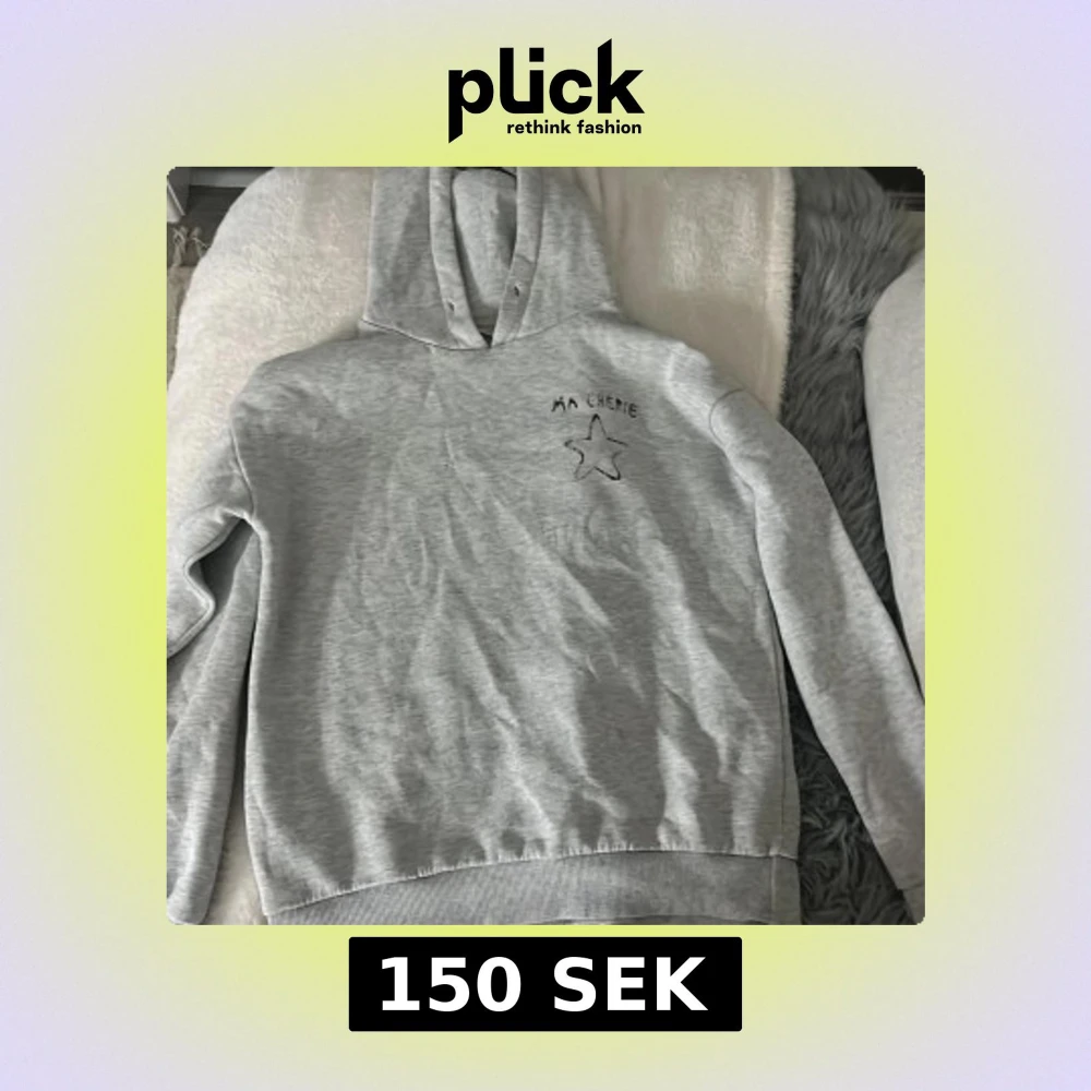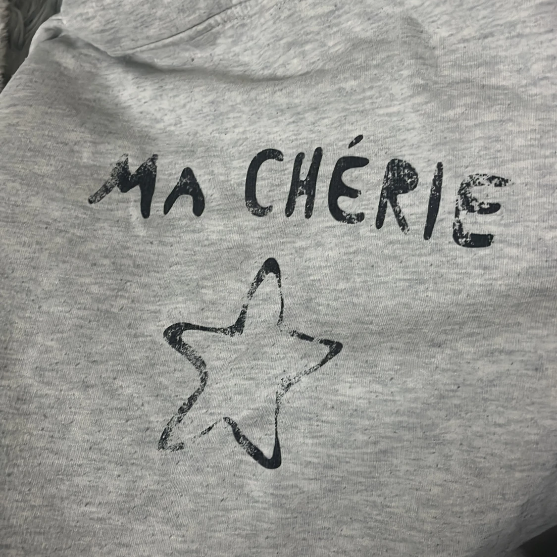 Säljer en ljusgrå hoodie med svart tryck 'Ma Chérie' och en stjärna både fram och bak. Tröjan har huva, långa ärmar och ribbade muddar vid ärmslut och nederkant. Perfekt för sig som exempelvis gillar Hov1💕STORLEK 146/152. Lite knott o sånt men annars i bra skick! Nästan aldrig använt❣️Saknar snören.