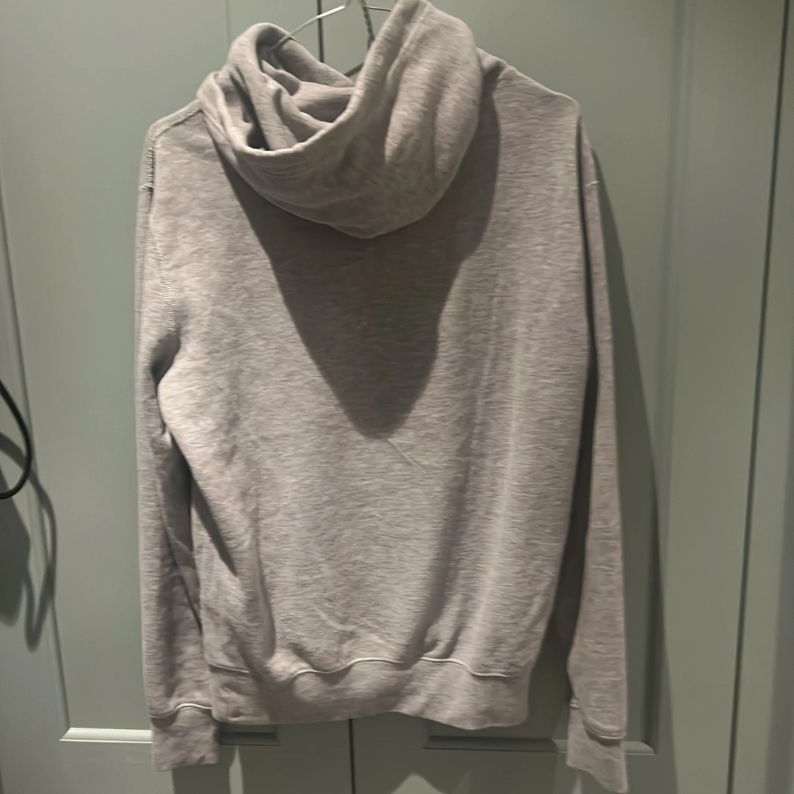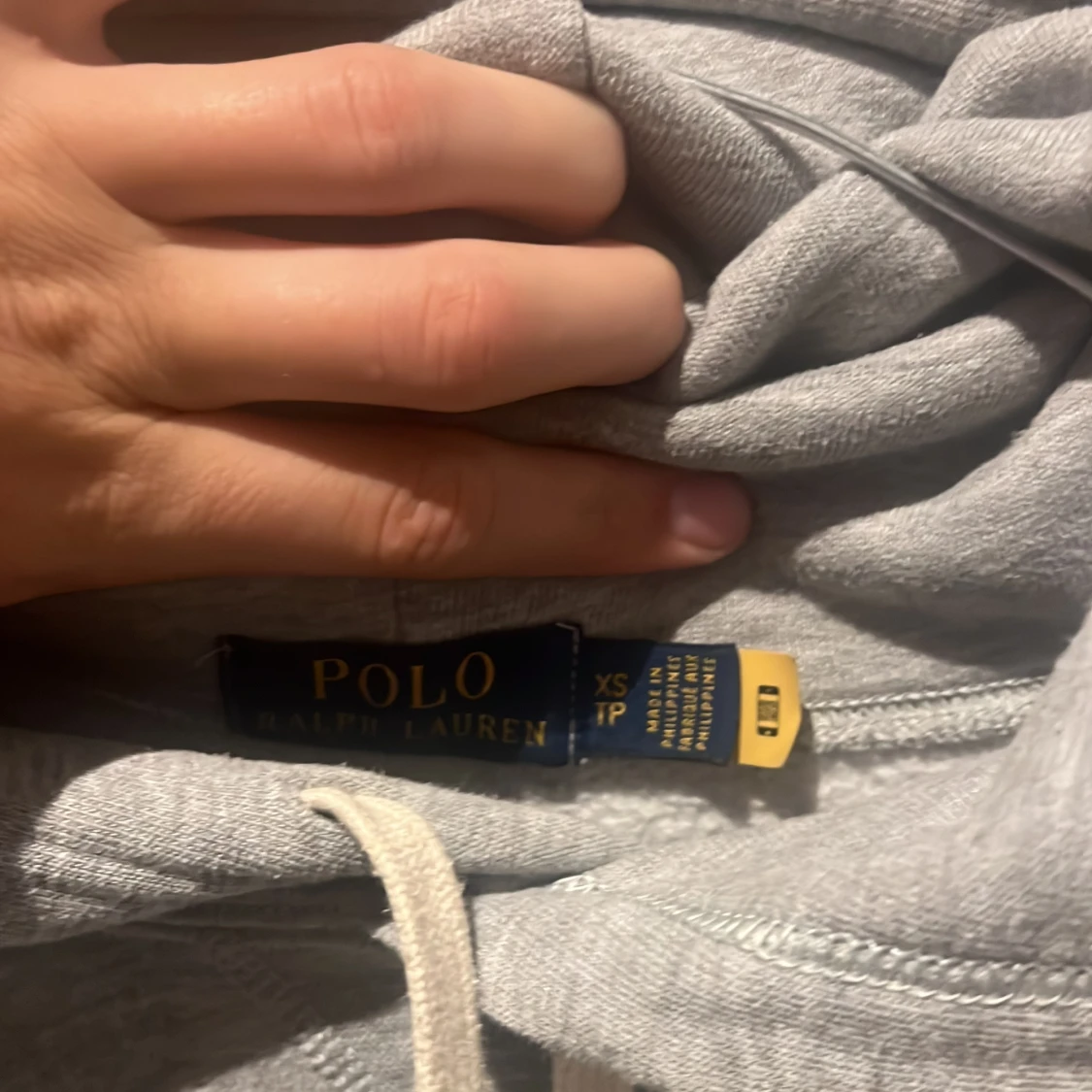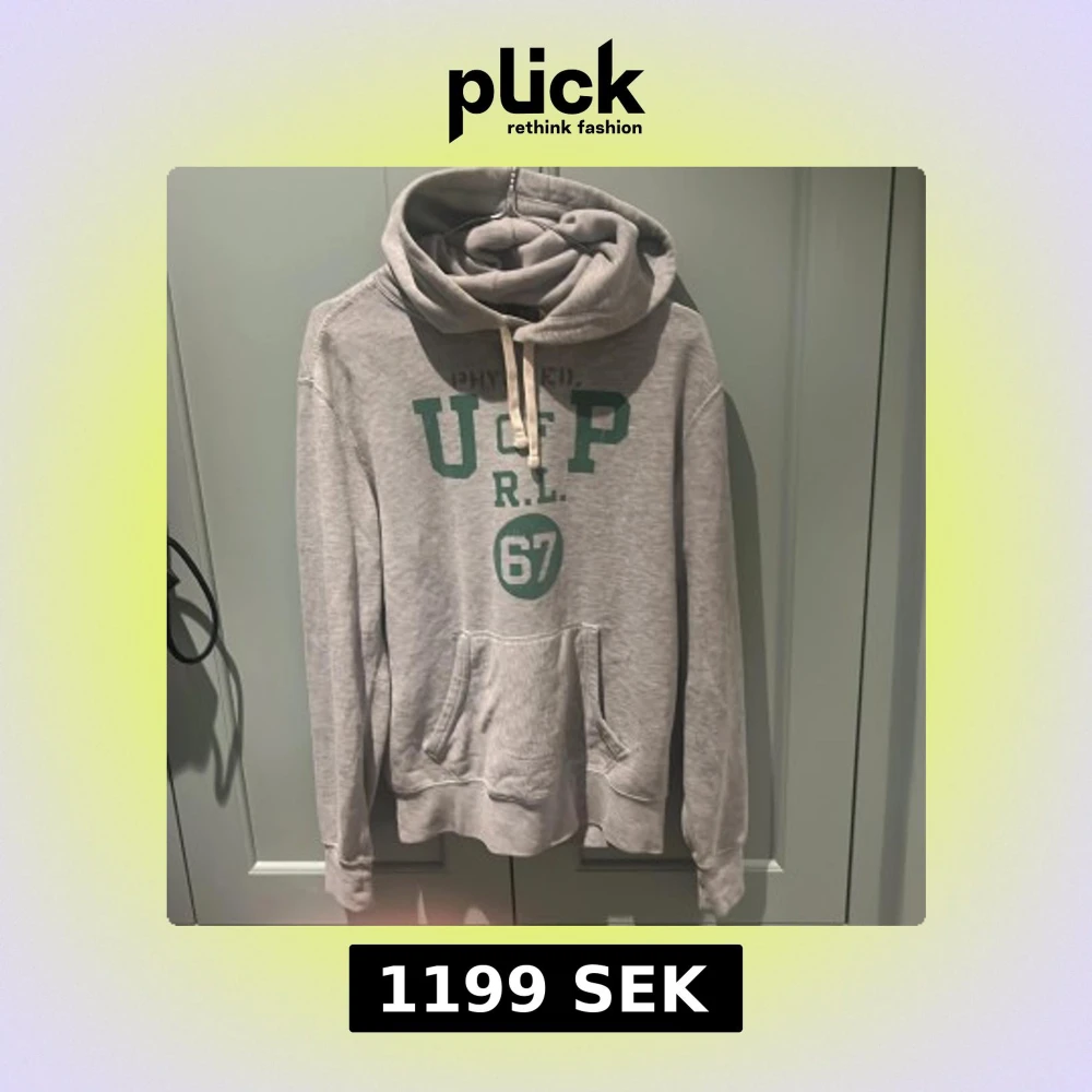 Grå hoodie från Polo Ralph Lauren i storlek XS. Tröjan har grönt tryck med texten 'USGP R.L. 67' på bröstet, snörning vid huvan och en klassisk magficka. Mjuk bomullskänsla och långärmad modell, perfekt för chill dagar.