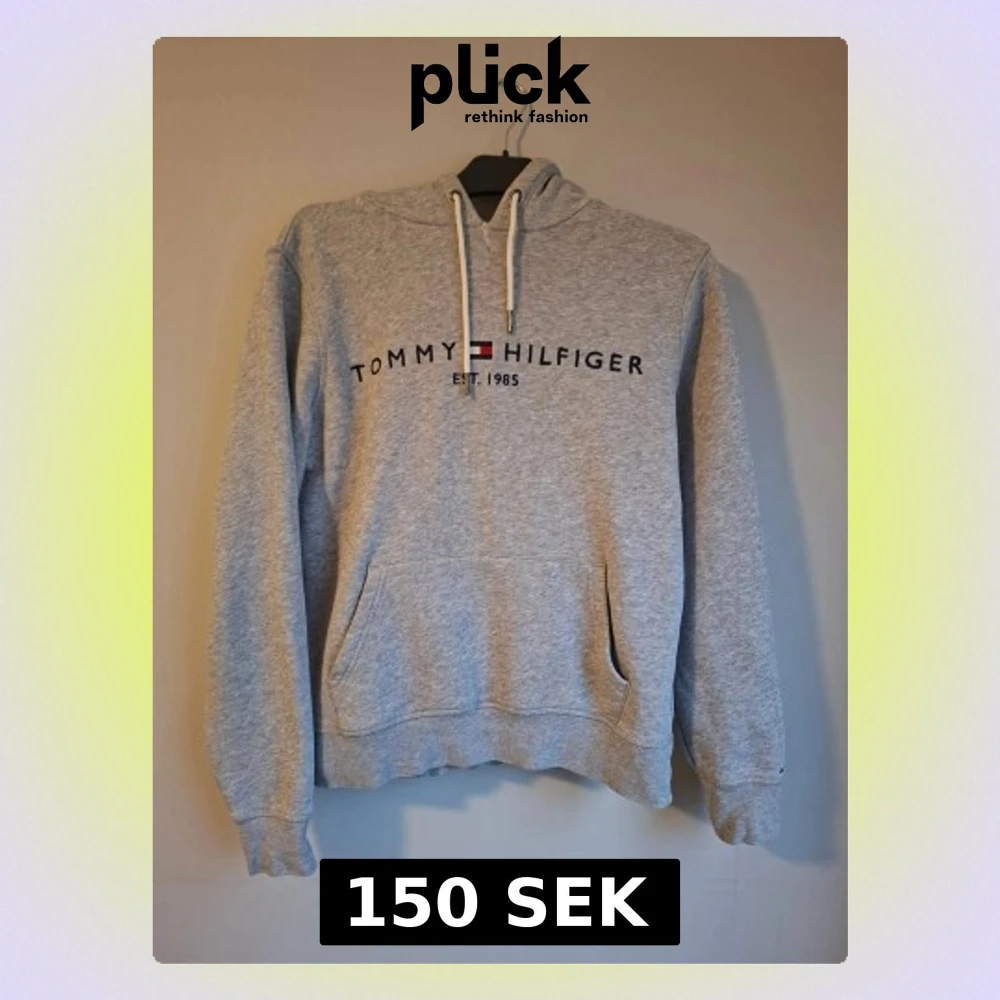 Snygg grå hoodie från Tommy Hilfiger med broderad logga och text 'EST. 1985' på bröstet. Tröjan har huva med vita snören, magficka och långa ärmar. Perfekt för chill dagar och enkel att matcha med jeans eller joggers. Har sytt lite uppe som man ser på bilden men de syns knappt!