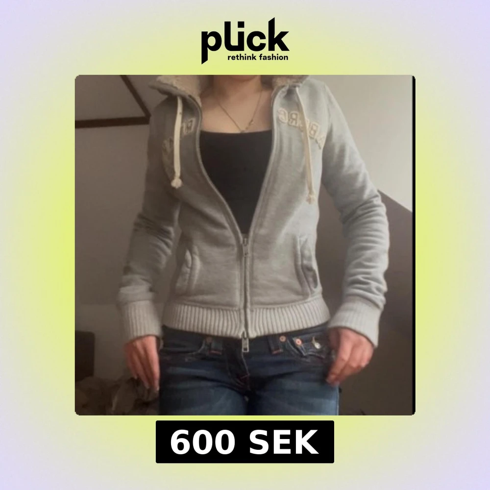 Mysig grå hoodiejacka från Abercrombie & Fitch med dragkedja och broderad logga framtill. Jackan har huva med vitt teddyfoder och dragsko, samt ribbade muddar och fickor på sidorna. Perfekt för kyliga dagar.
