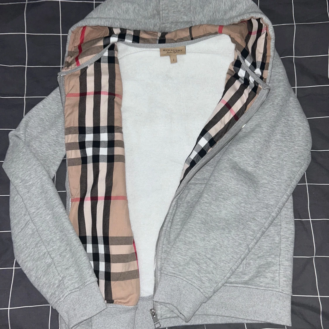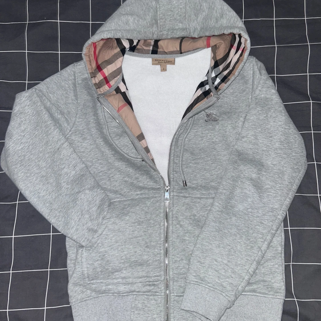 Säljer en grå huvtröja från Burberry med dragkedja och ett ikoniskt rutigt foder i huvan. Tröjan har en broderad logga på bröstet och är tillverkad i mjukt bomullsmaterial. Perfekt för en stilren och bekväm look.