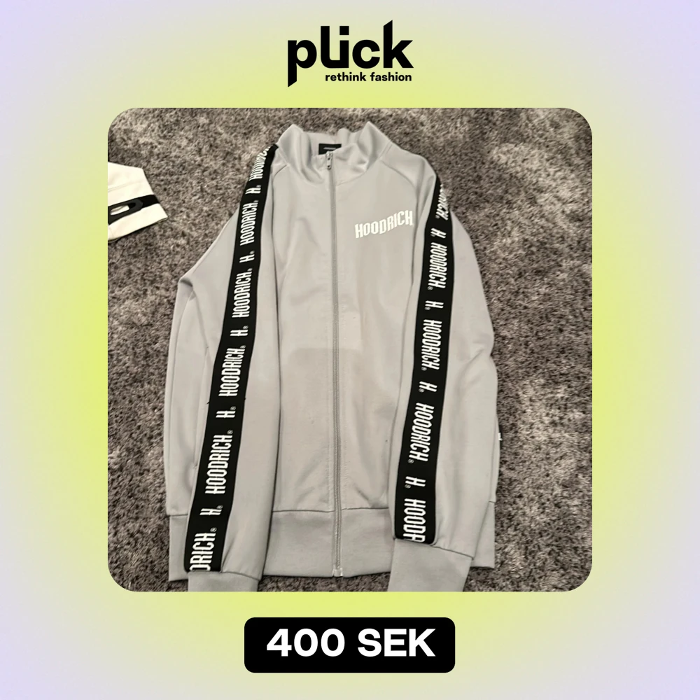 Säljer en snygg grå kofta från Hoodrich med dragkedja och svarta band med logga längs ärmarna. Byxorna till den finns skriv i dm. Köp båda för bättre pris. Perfekt för en casual look eller träning. Koftan har en hög krage och är i mycket bra skick.