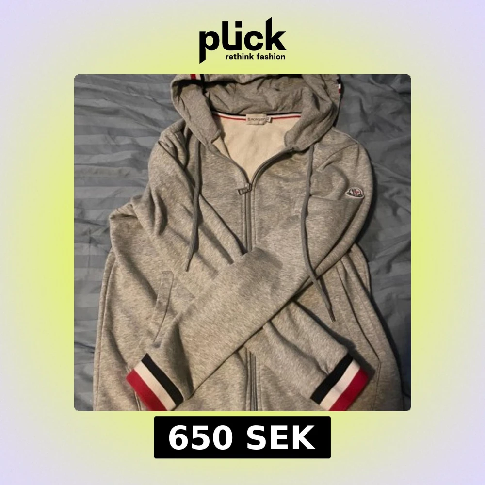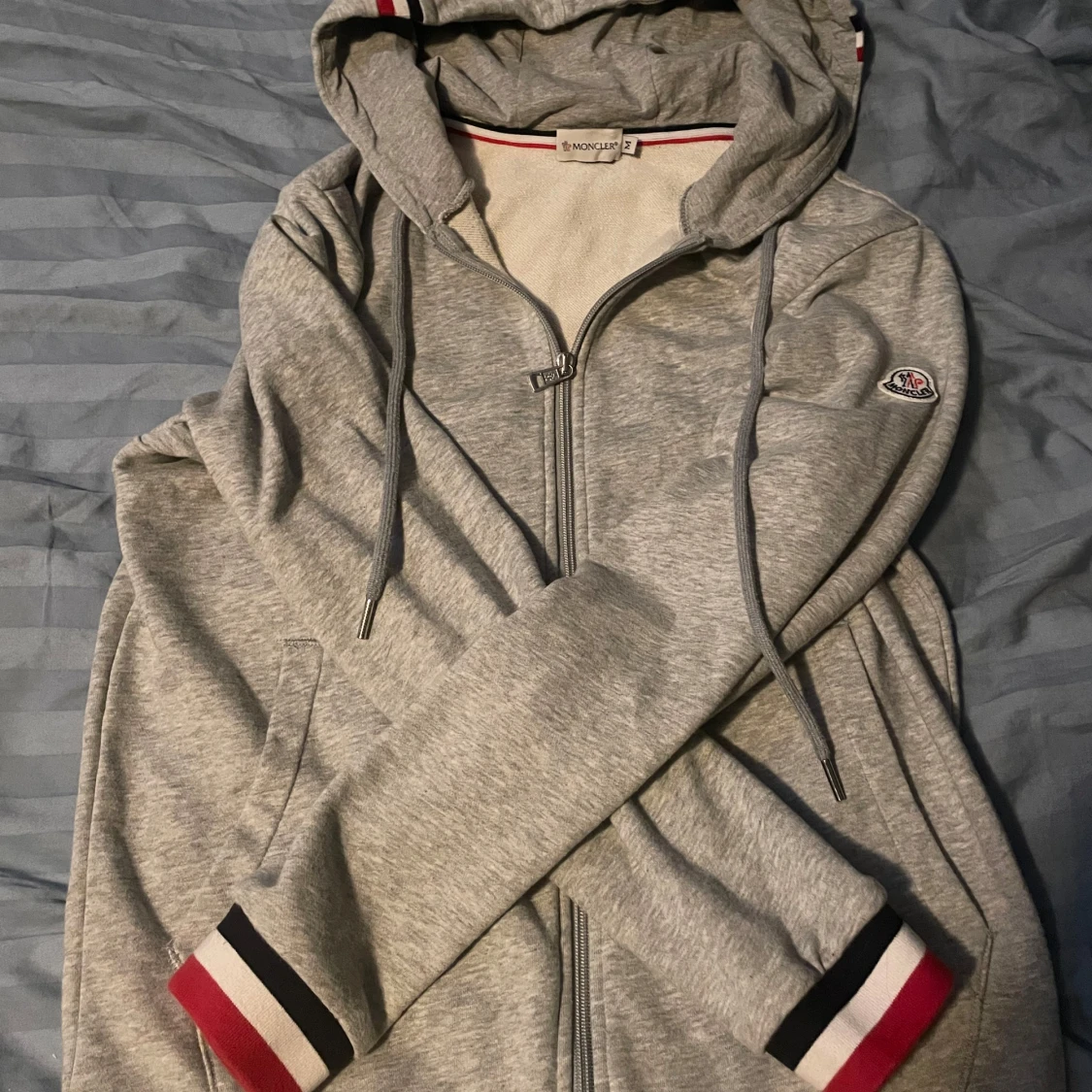 Snygg grå hoodie från Moncler med dragkedja och huva. Tröjan har ribbade muddar med röd, vit och svart detalj samt Moncler-logga på ärmen. Perfekt för dig som gillar stilrena och sportiga plagg med premiumkänsla.