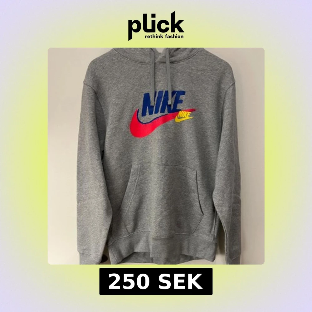Säljer en grå hoodie från Nike med stor färgglad logga framtill i blått, rött och gult. På ryggen finns tre mindre Nike-loggor i sammaj färger. Tröjan köptes in men användes aldrig.