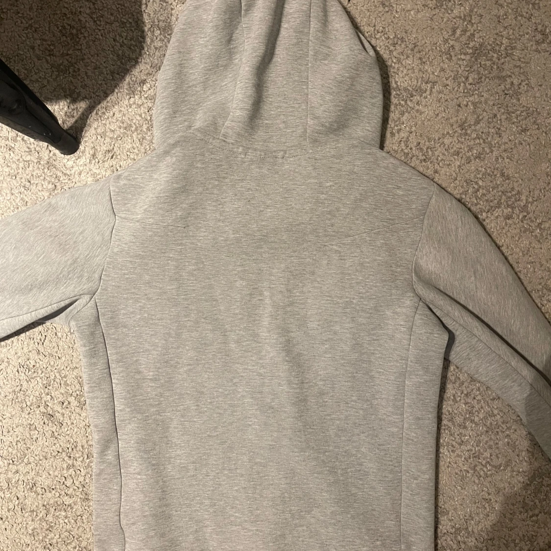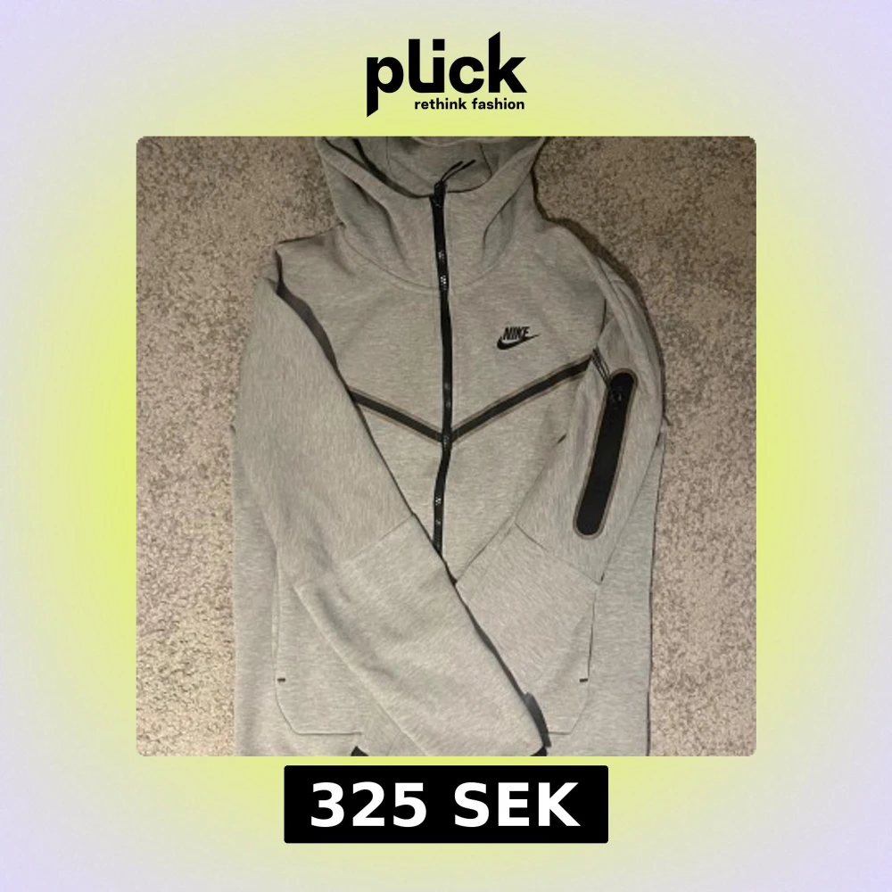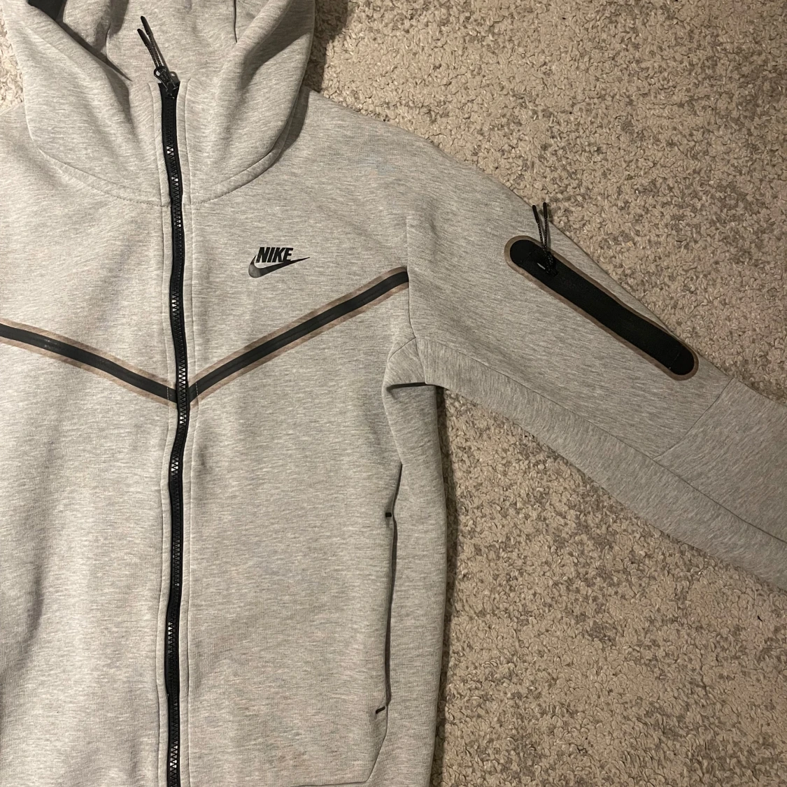 Säljer en grå hoodiejacka från Nike med svarta detaljer och dragkedja framtill. Jackan har en ficka med dragkedja på ärmen och en sportig design med huva. Perfekt för dig som gillar stilren och bekväm streetwear.