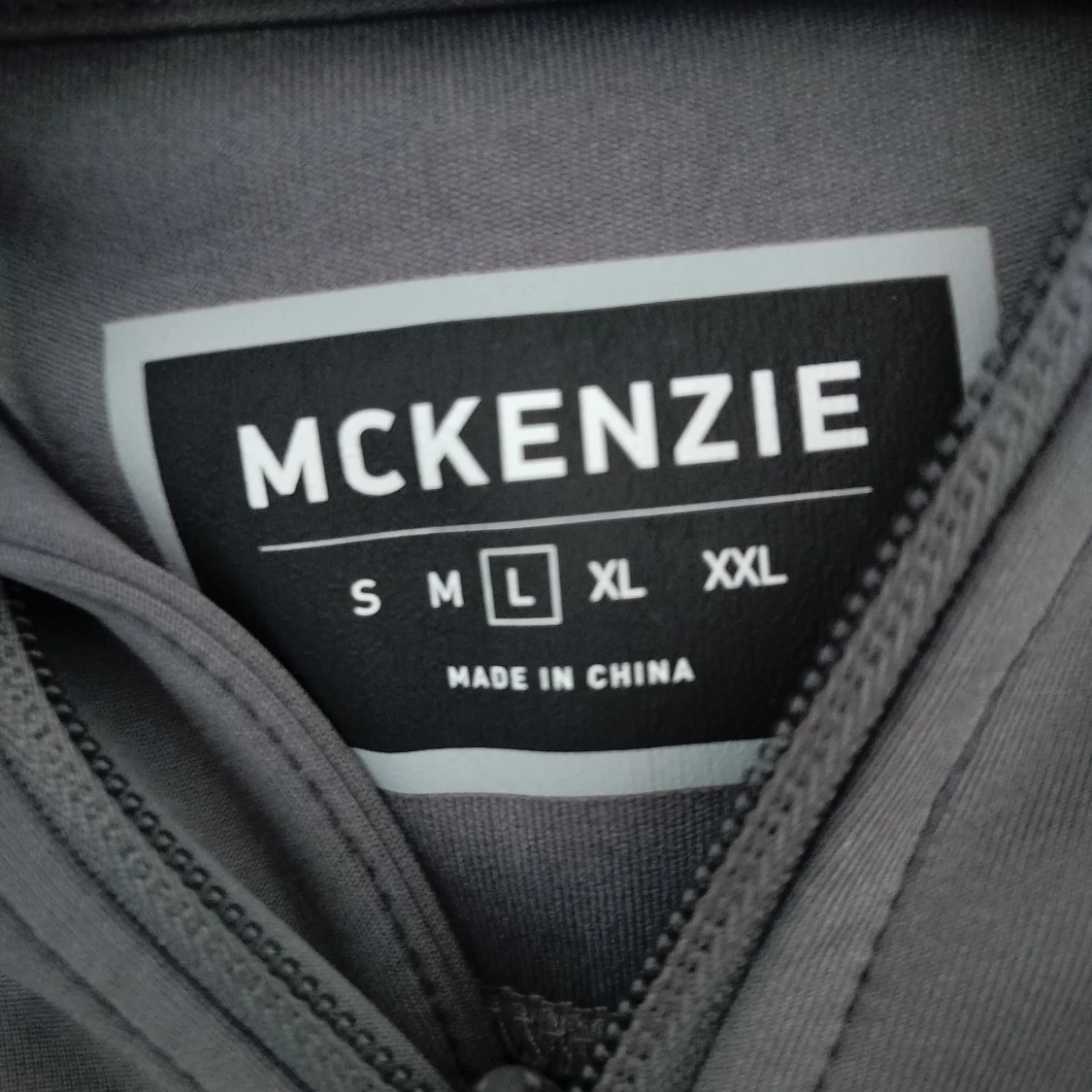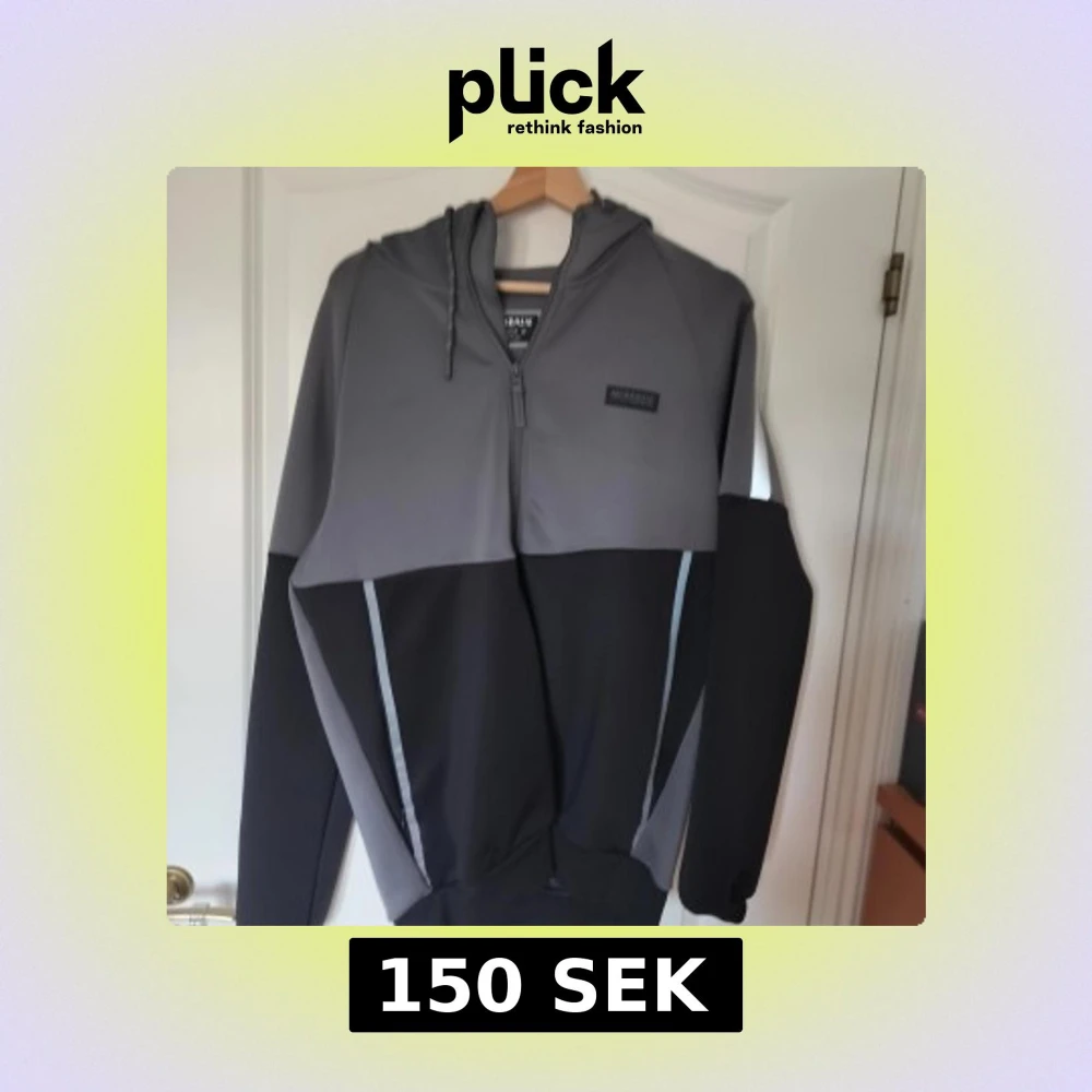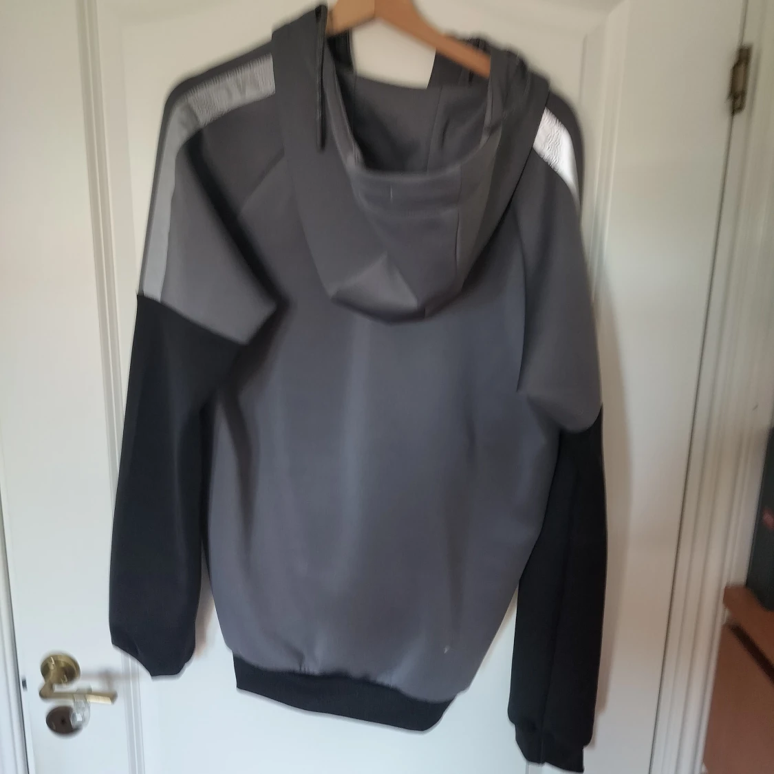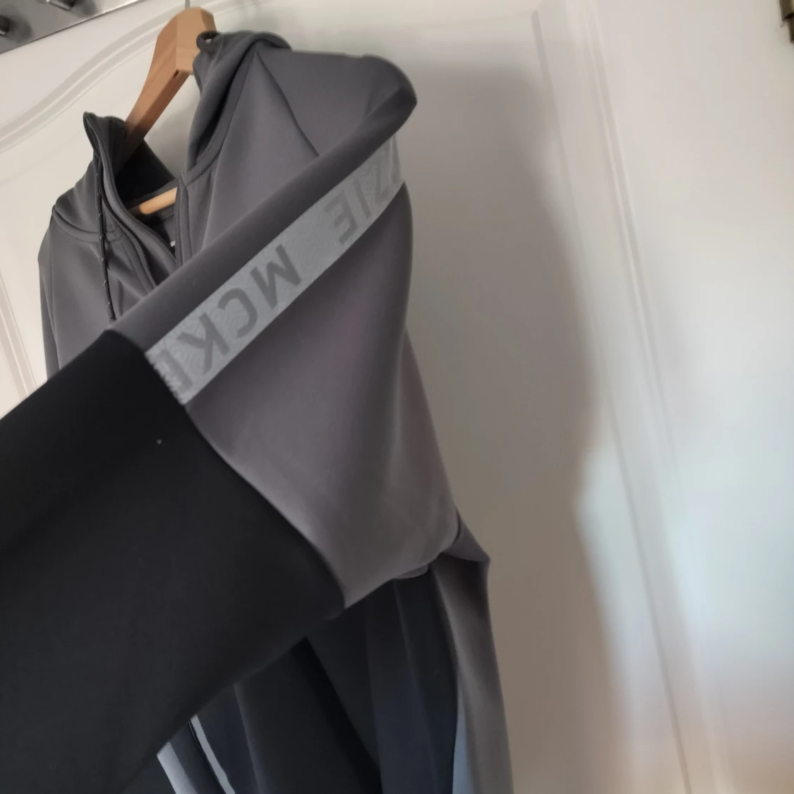 Säljer en snygg hoodie från McKenzie i grått och svart med dragkedja framtill och huva. Tröjan har långa ärmar, svarta paneler och reflekterande detaljer på axlarna.