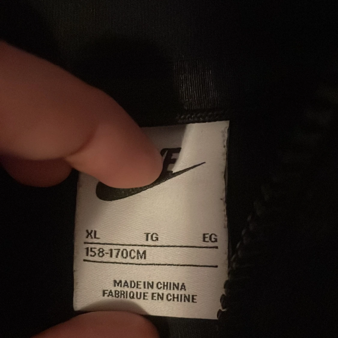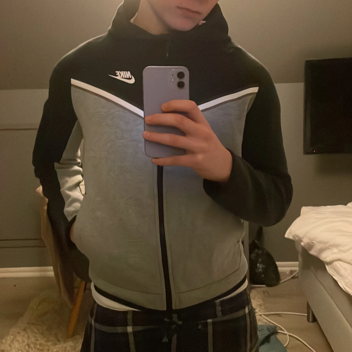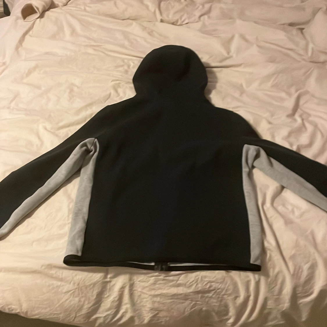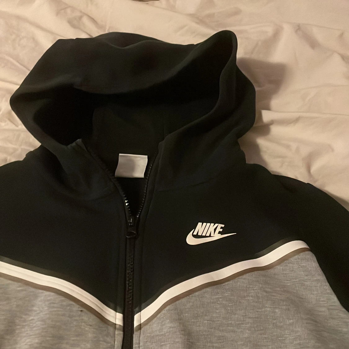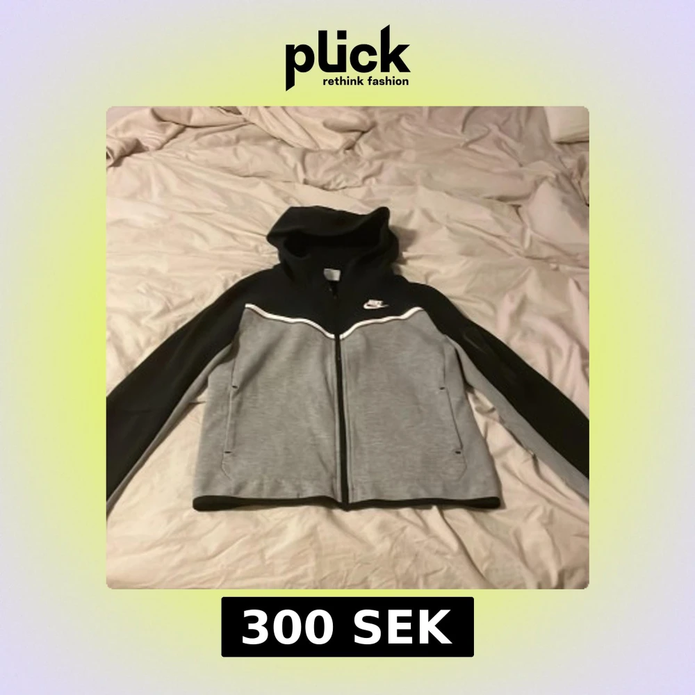 Säljer en grå och svart huvtröja från Nike med dragkedja och vit logga på bröstet. Tröjan har en huva och långa ärmar med en stilren design. Perfekt för en sportig look eller avslappnade dagar.