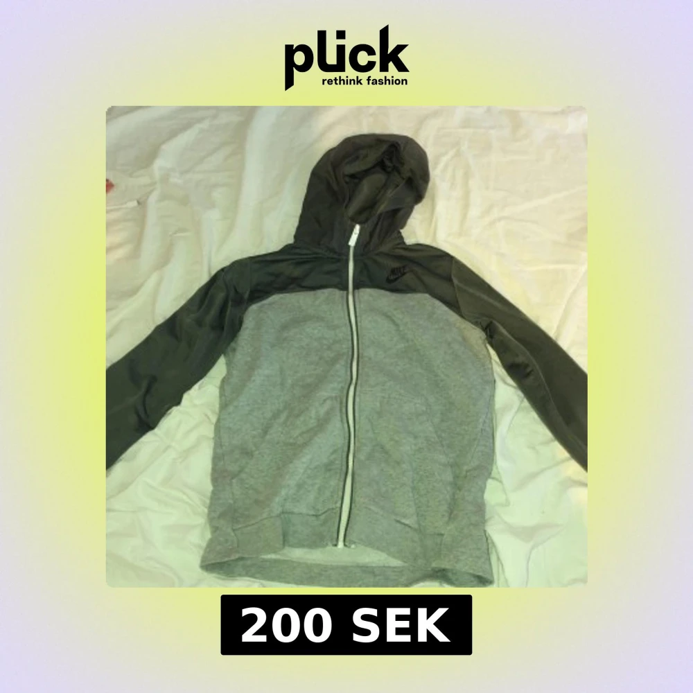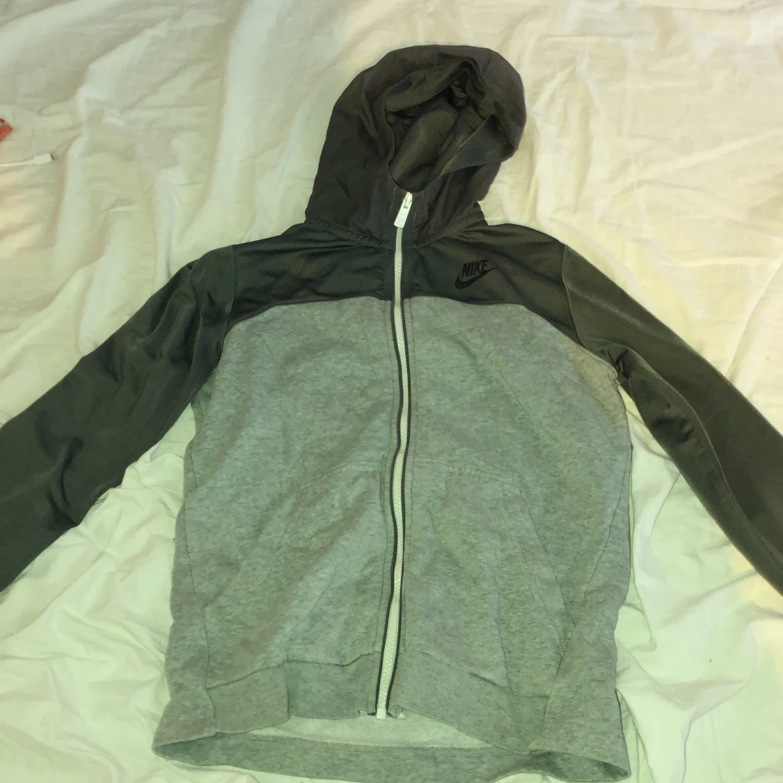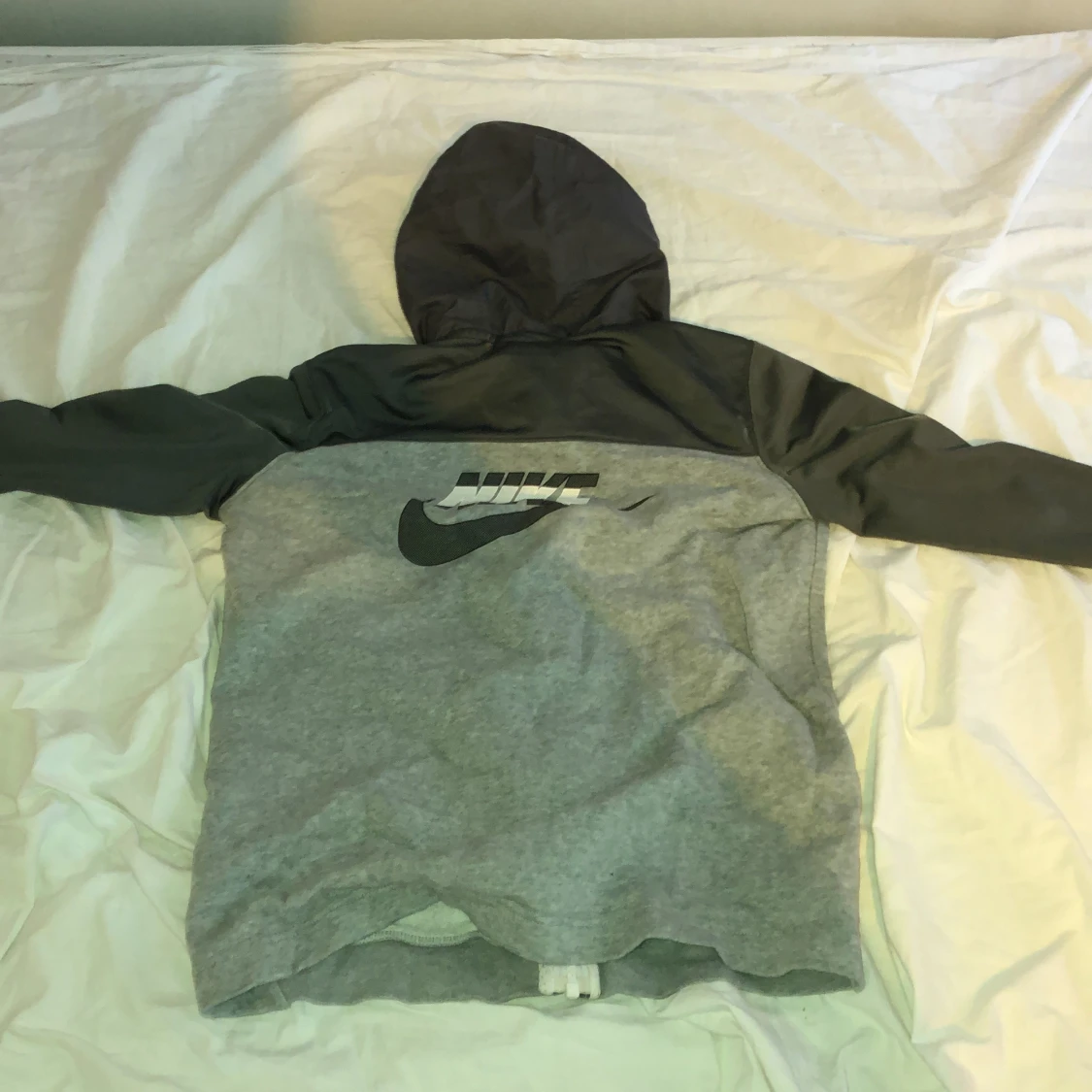 Nike vindjacka i grått och svart med huva och hel dragkedja framtill. Jackan har långärmade svarta ärmar och grå kropp, samt Nike-logga på bröstet och ryggen. Perfekt för chill eller träning, snygg och sportig look.