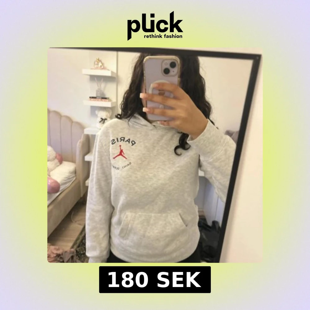 Säljer en ljusgrå hoodie från Jordan x Paris Saint Germain med röd logga och text på bröstet samt stor Paris 23-tryck på ryggen. Tröjan har huva, magficka och är långärmad. Perfekt för dig som gillar sportig streetstyle.
